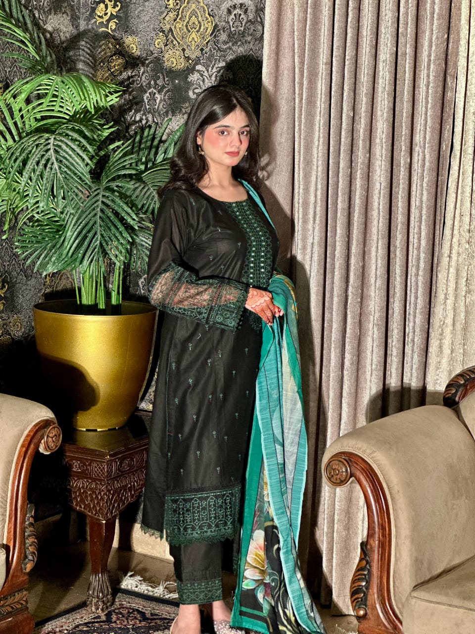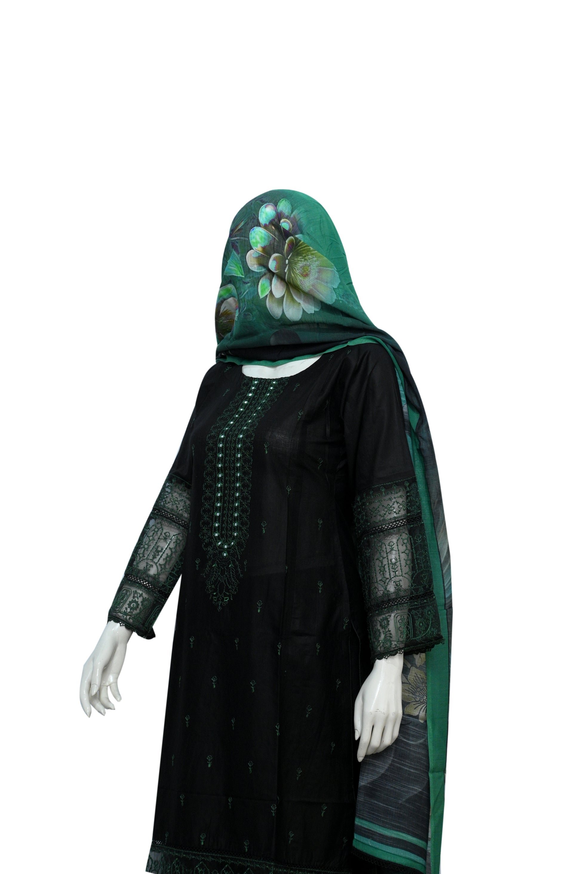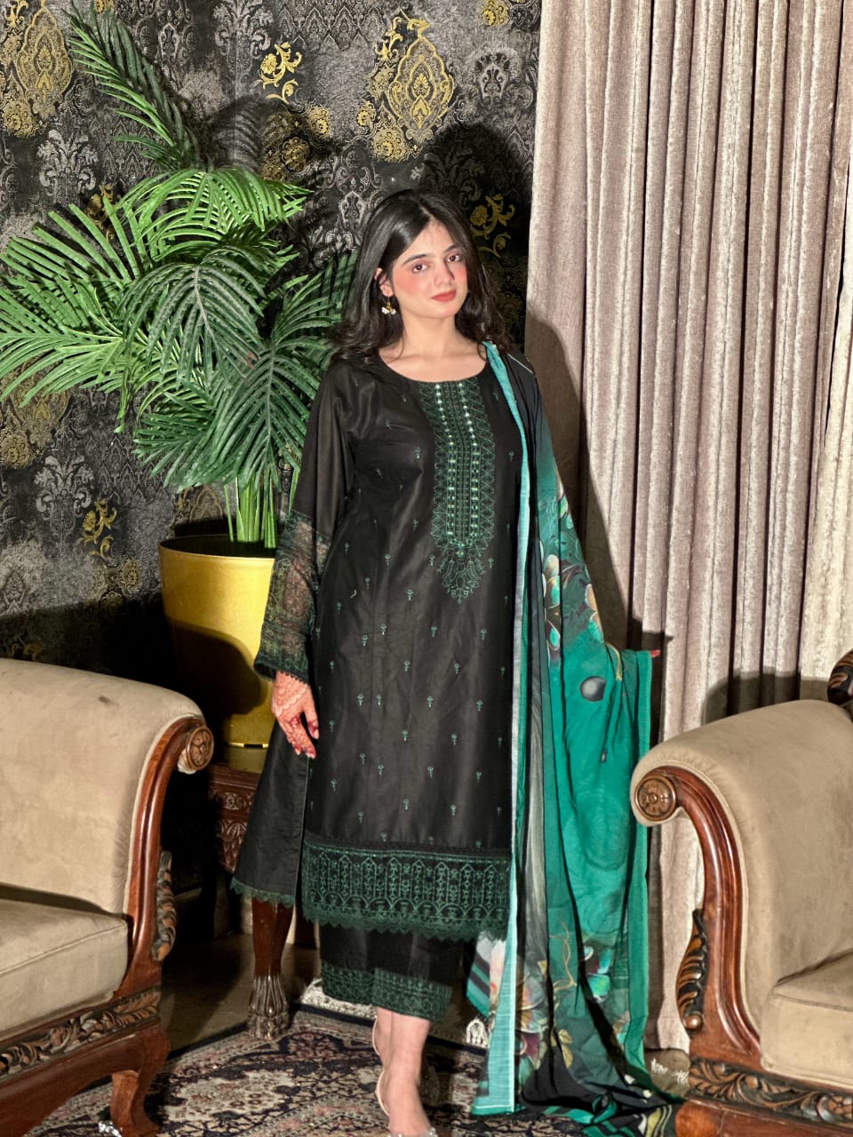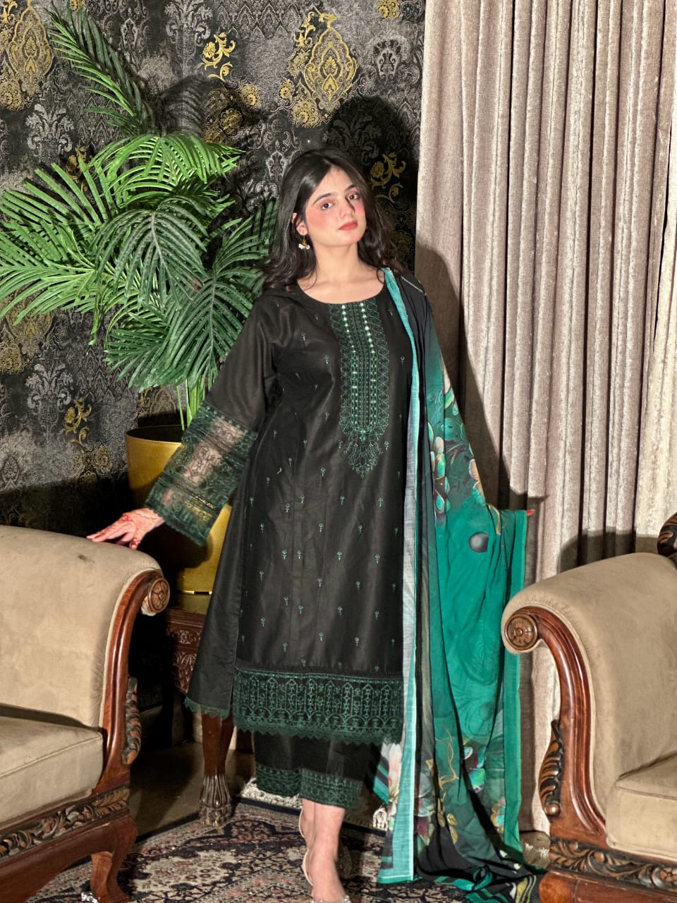This sophisticated three-piece outfit features a rich black shirt with a round neckline, intricately embroidered with green thread work on the front, sleeves, and hem. It is paired with matching black trousers, enhanced with green embroidered borders at the hem. The look is completed with a vibrant green and black printed dupatta, adding a splash of color and contrast to the ensemble.