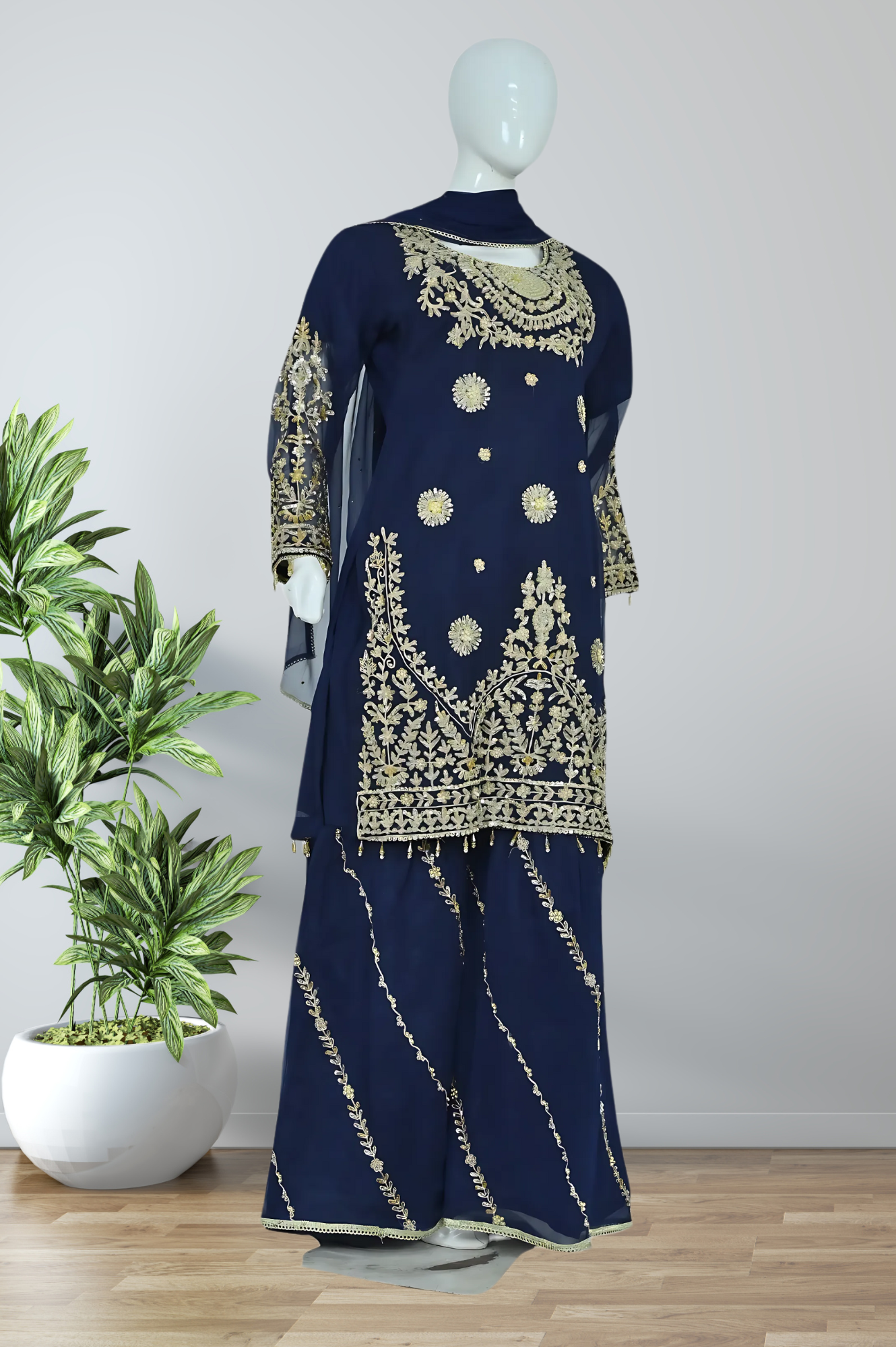 Swera B 1104 (A) è un costume elegante composto da 3 pezzi: una tunica dal tessuto leggero di shaffun con delicato ricamo a mano e decorazioni in tilla; dei pantaloni comodi e raffinati ricoperti da kattan e manovrati con abilità manuali; infine, un velo in shaffun con una splendida bordatura in pizzo a completare il tuo look. Taglia unica, per una vestibilità perfetta.