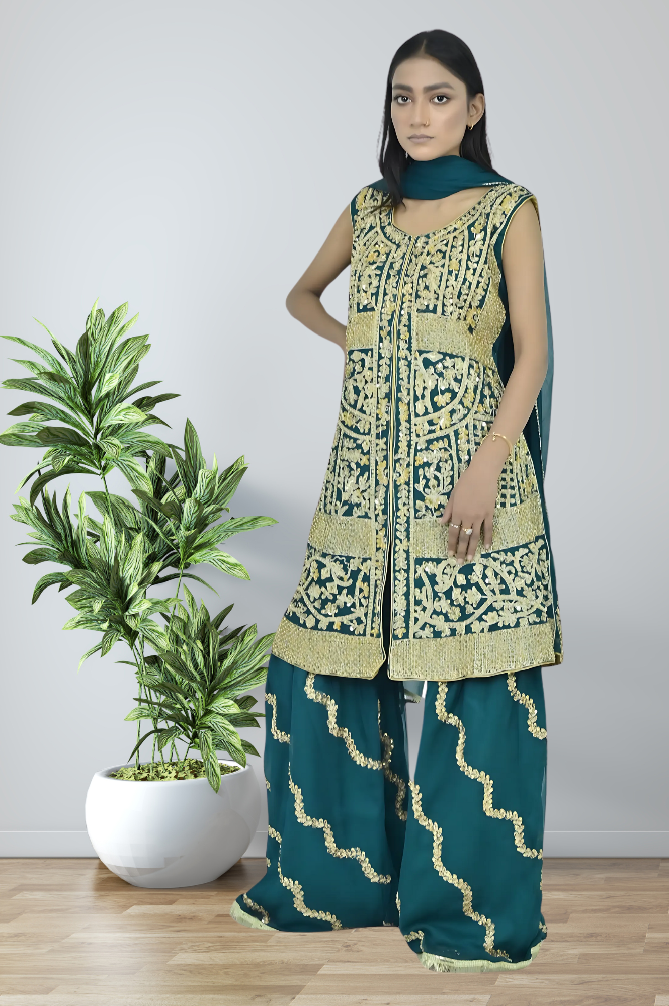 Il Swera B 1104 (C) è una combinazione di eleganza e artigianato pregiato. Il suo top in kattan e shaffun, decorato con ricami e lavoro a mano, dona un tocco di classe. La parte inferiore in shaffun con bordi in pizzo è impreziosita da dettagli in tilla e lavoro a mano. Il dupatta in shaffun completa il look impeccabile. Taglia unica.