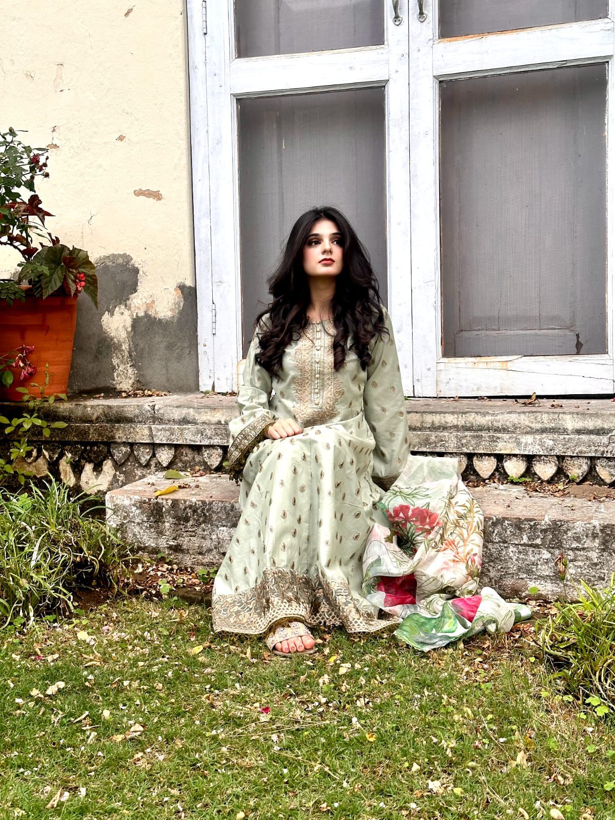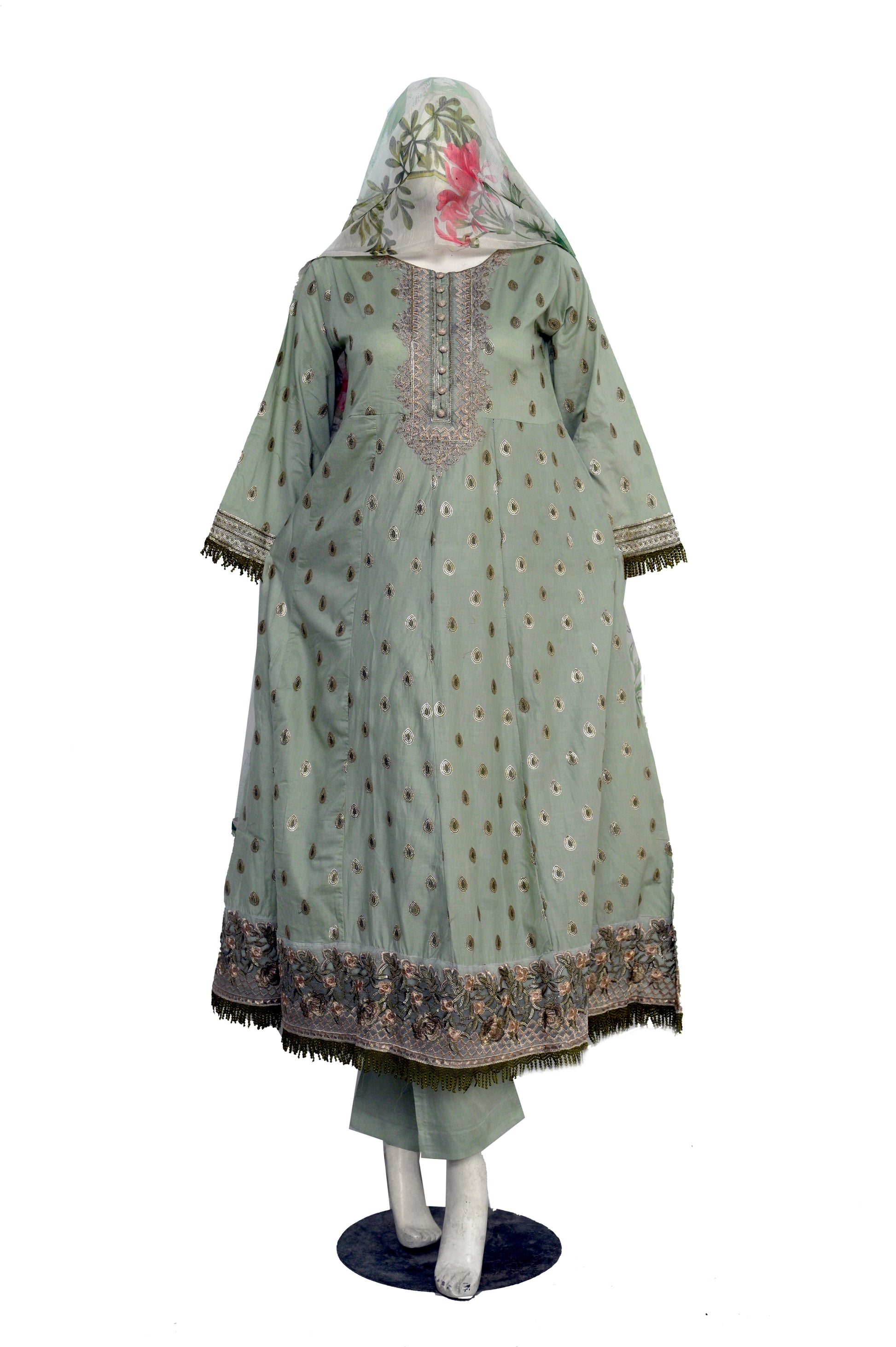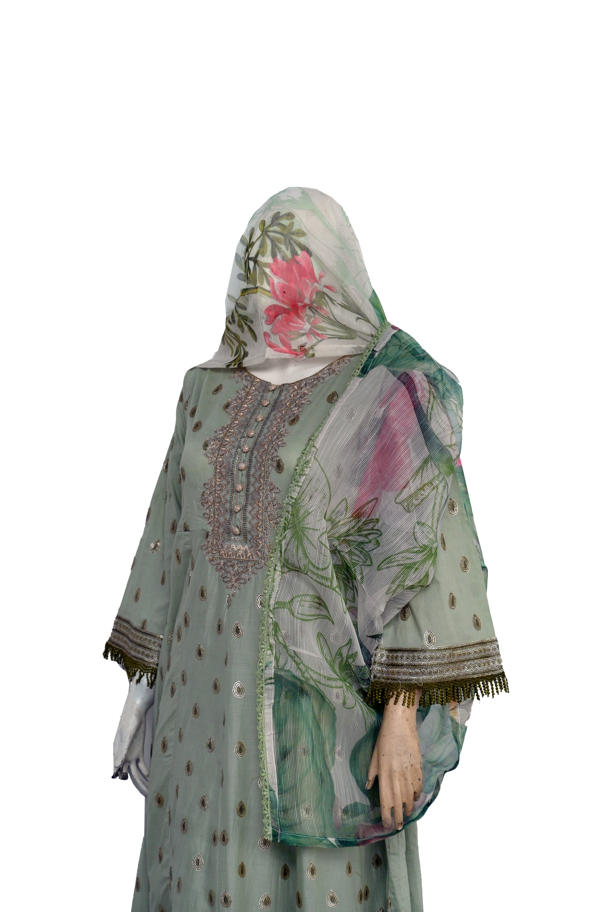Swera B 14 è un vestito pronto all'uso in 3 pezzi, realizzato con tessuto di cotone di alta qualità. La lavorazione in chikankari e il ricamo pesante sul collo, il fondo e le maniche lo rendono un capo di pregio. Il suo dupatta stampato digitalmente in tessuto di prato, arricchito da bordi in pizzo, lo rende un pezzo unico e raffinato.