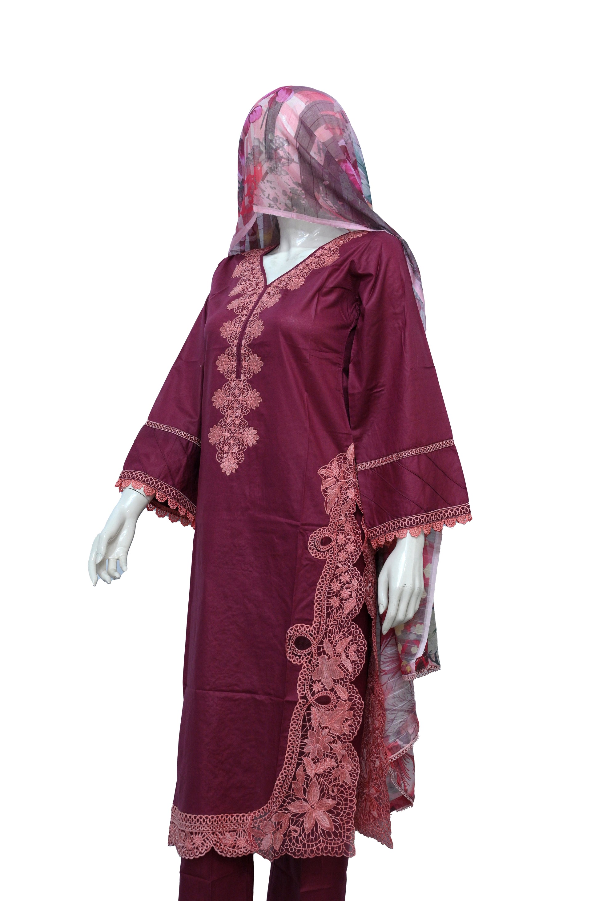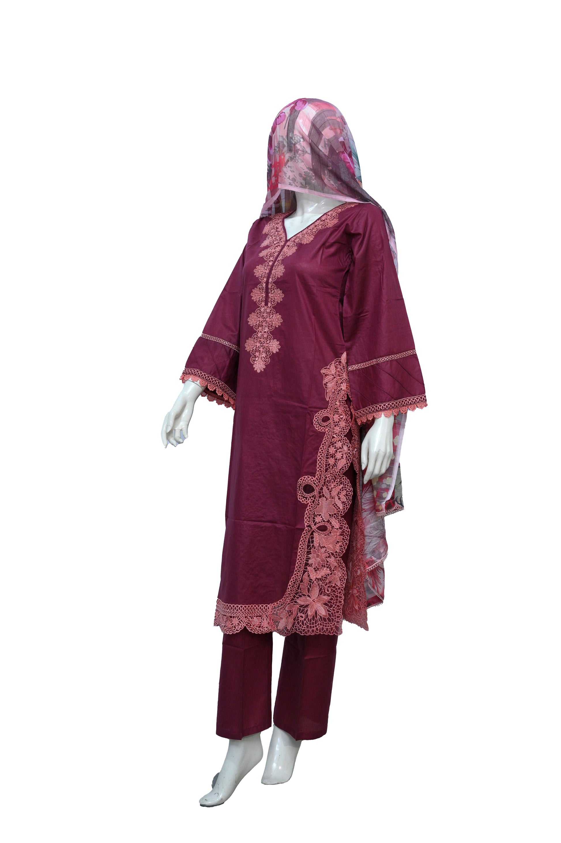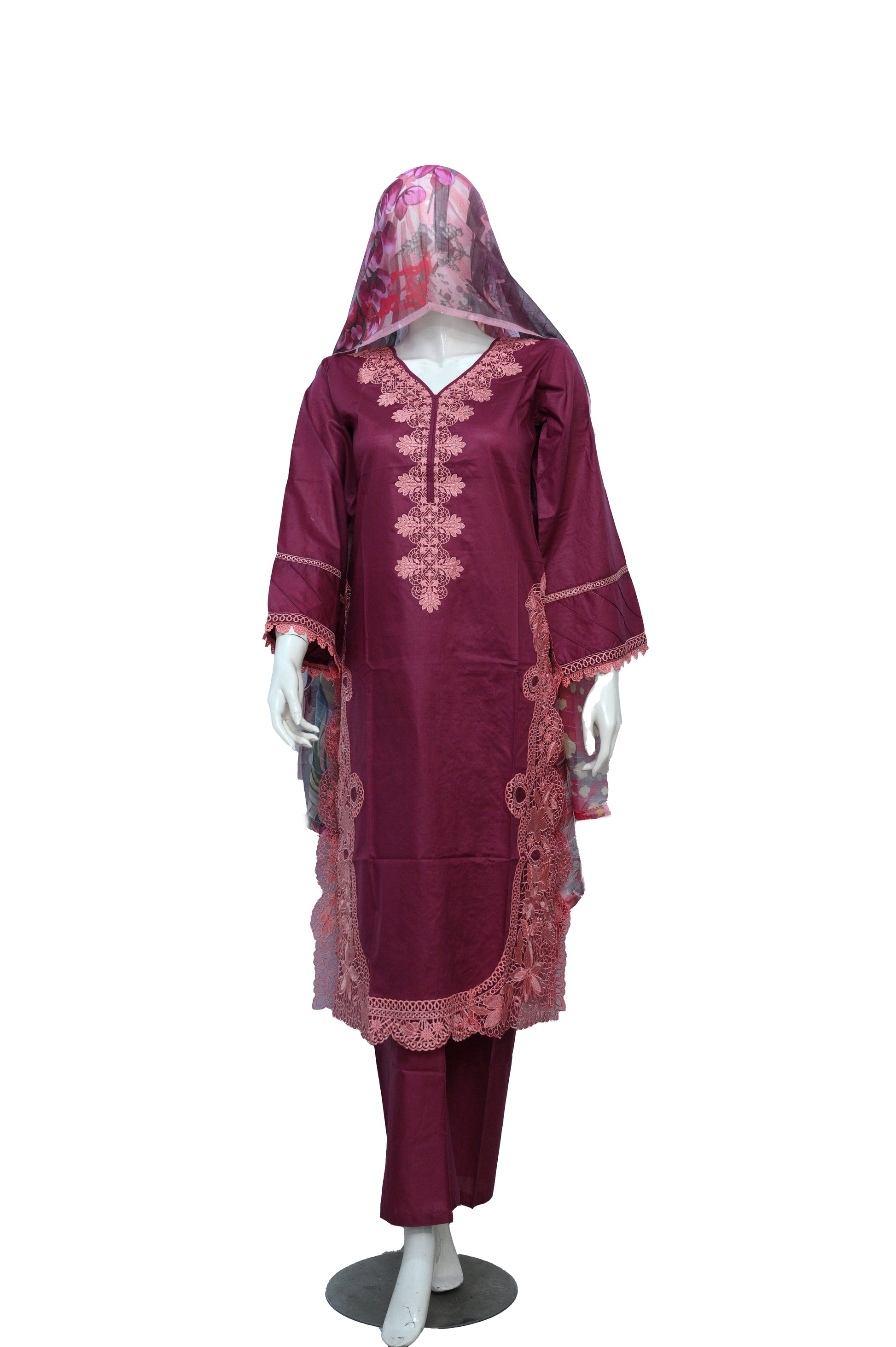 This elegant three-piece outfit features a straight-cut shirt adorned with intricate peach lace embroidery along the neckline, extending down the center and elegantly framing the sides of the shirt with a wide, floral lace border. The sleeves are enhanced with matching peach lace details, adding a touch of sophistication. It is paired with plain magenta straight trousers and completed with a semi-sheer printed dupatta in shades of pink and orange, creating a vibrant and feminine ensemble.