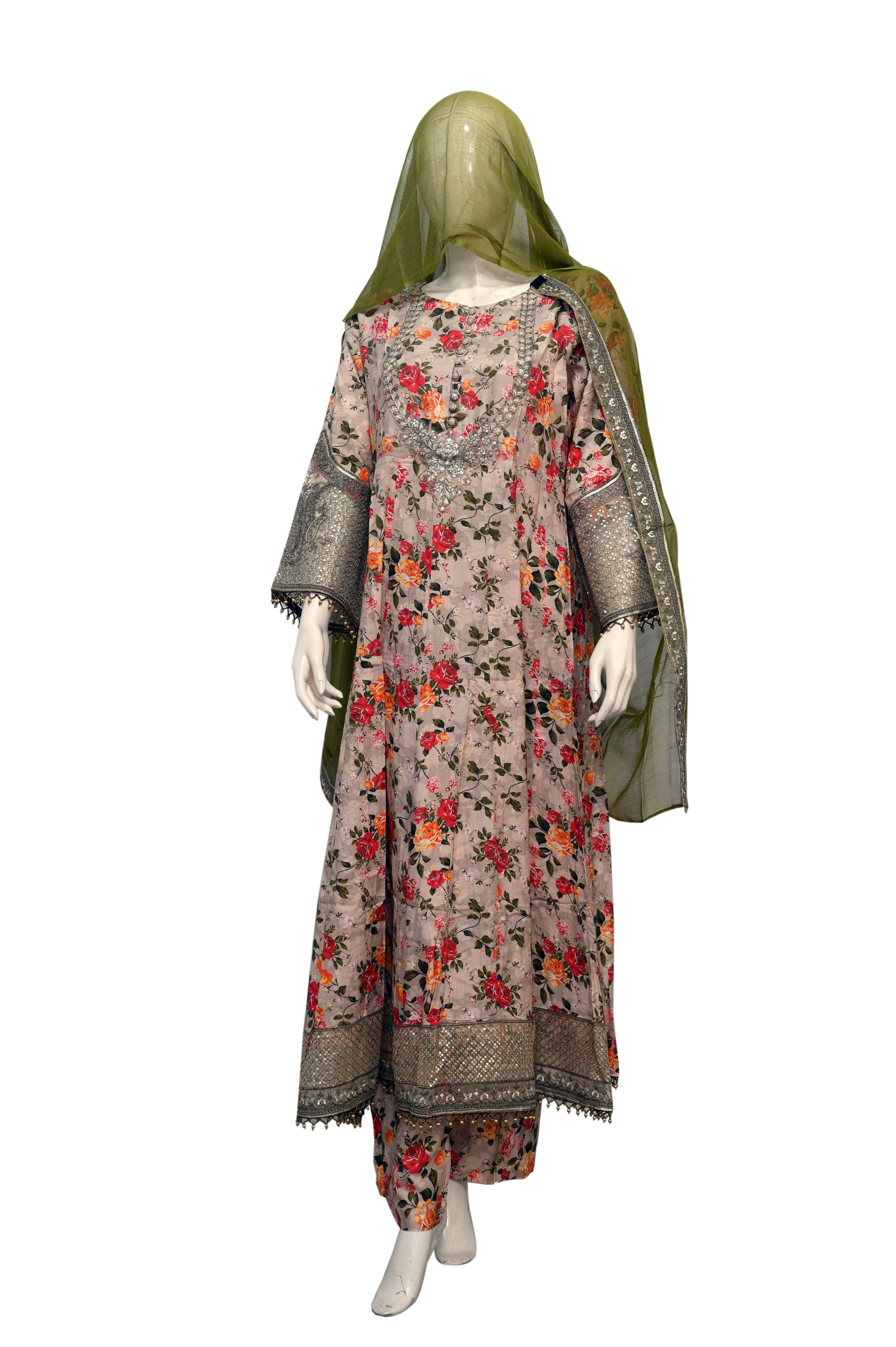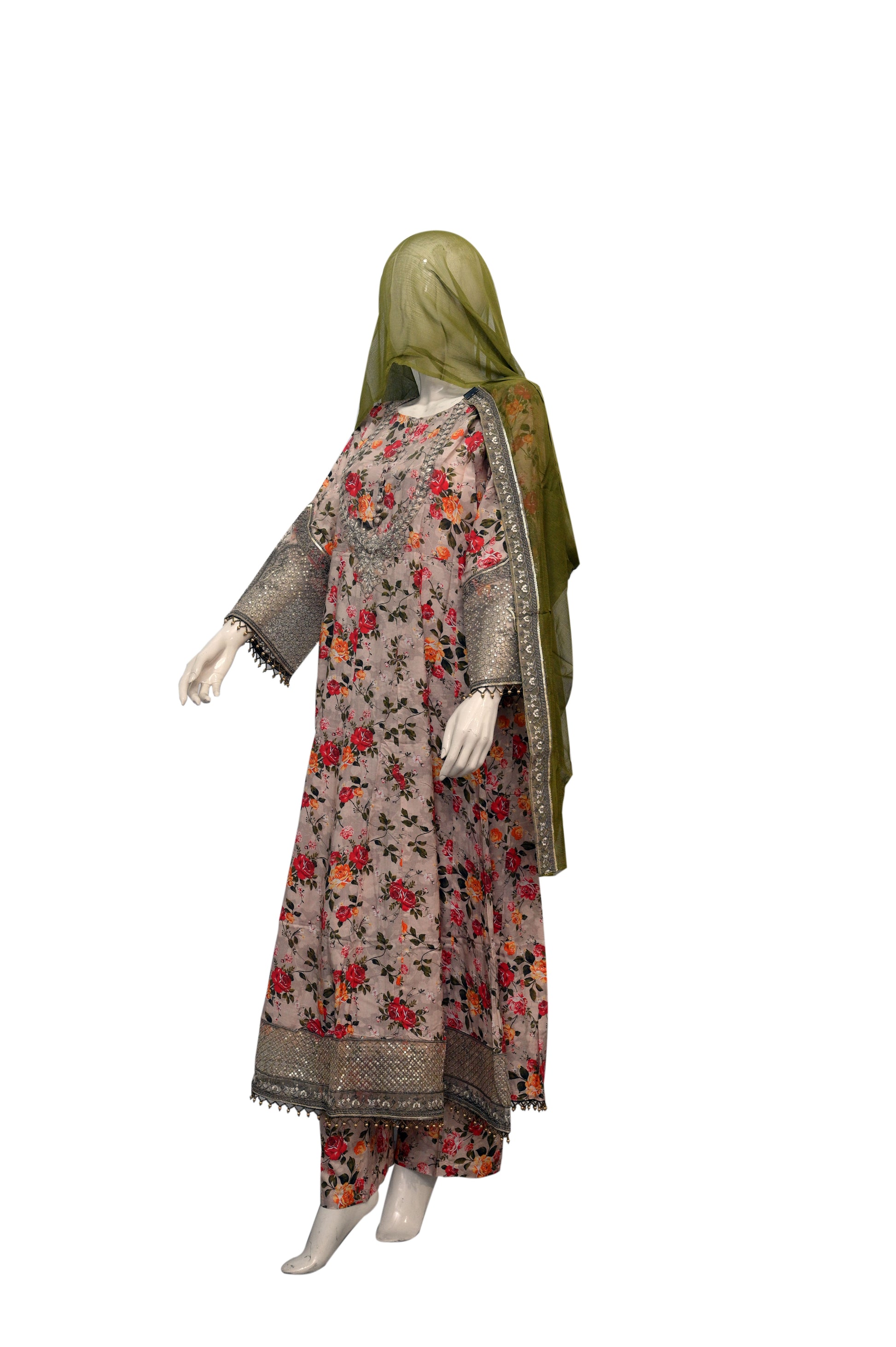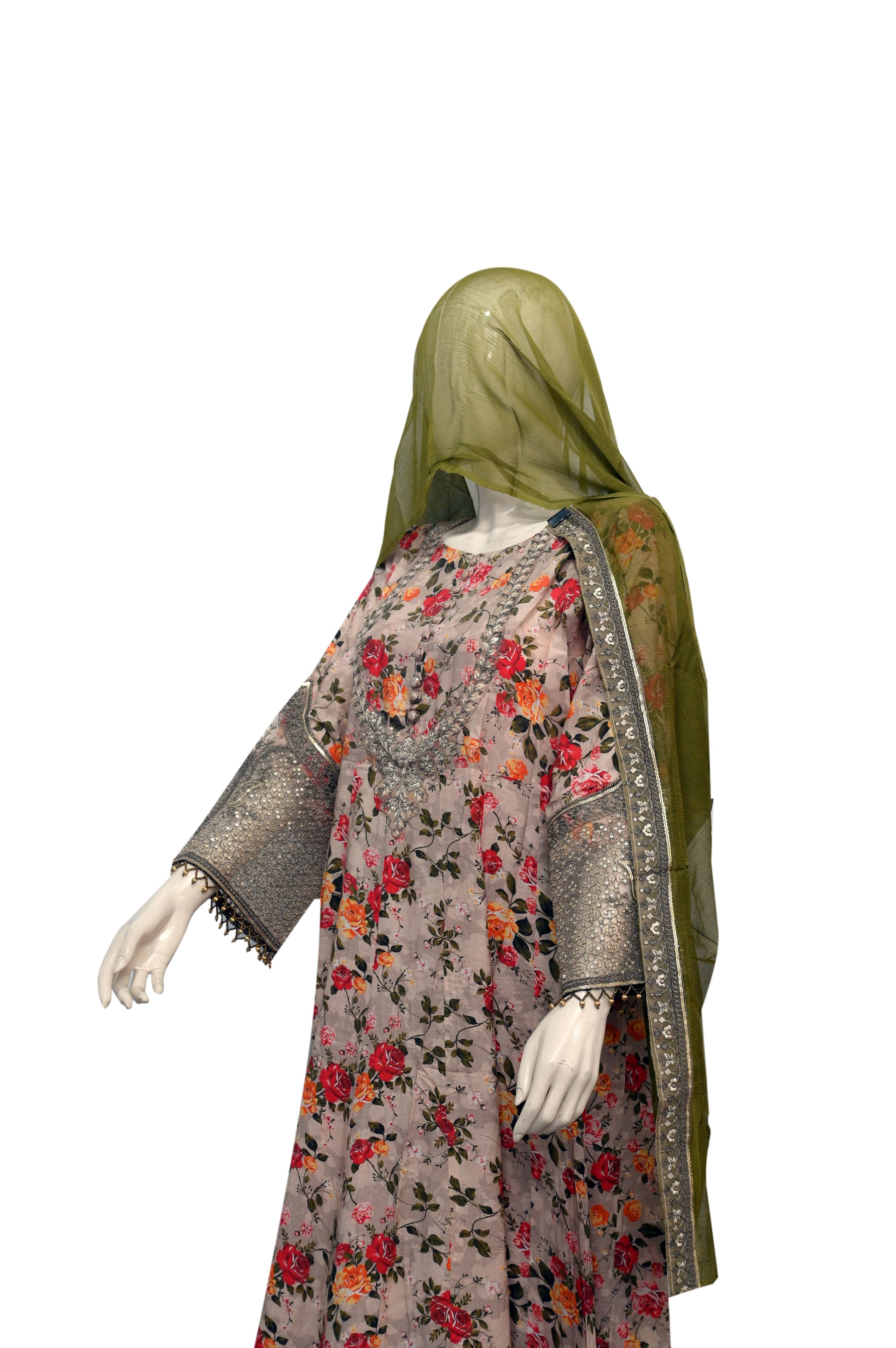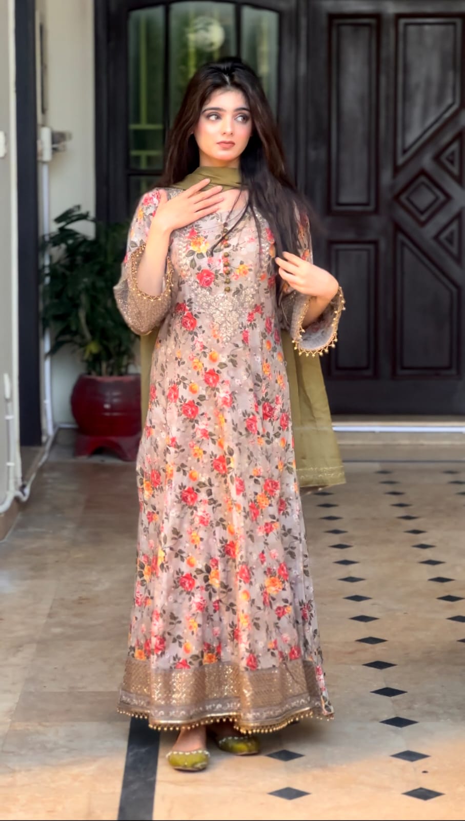 This is a knee-length floral frock. It has detailed embroidery on the neckline and sleeves, with a gold embroidered border at the hem. The outfit comes with a matching printed trouser in the same floral pattern and a green chiffon dupatta