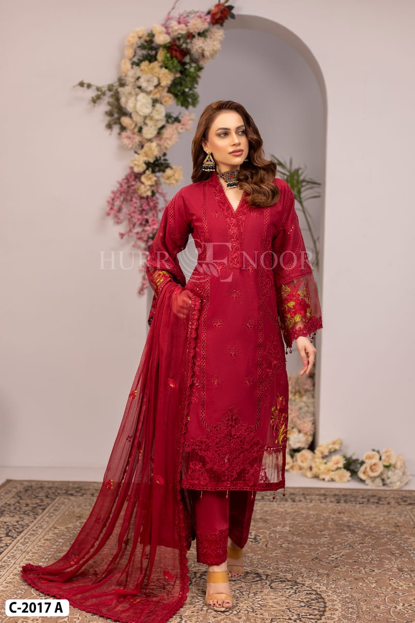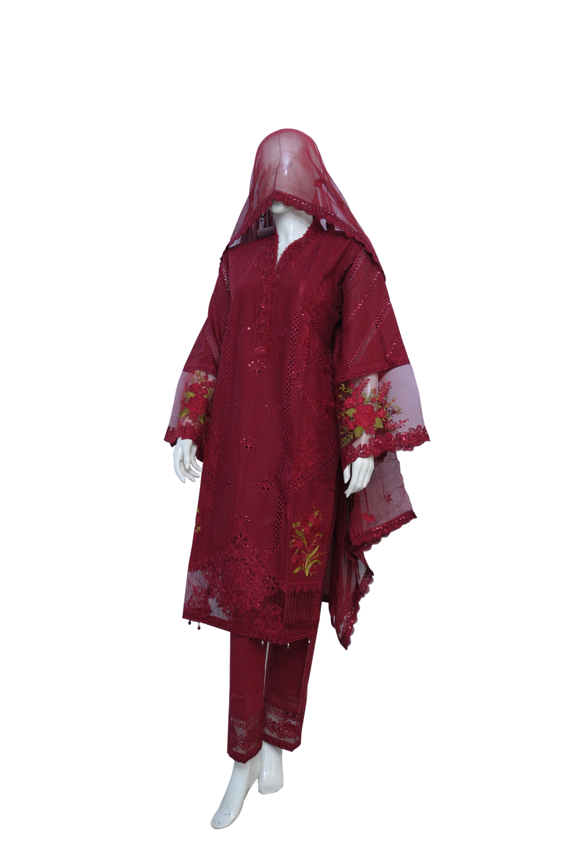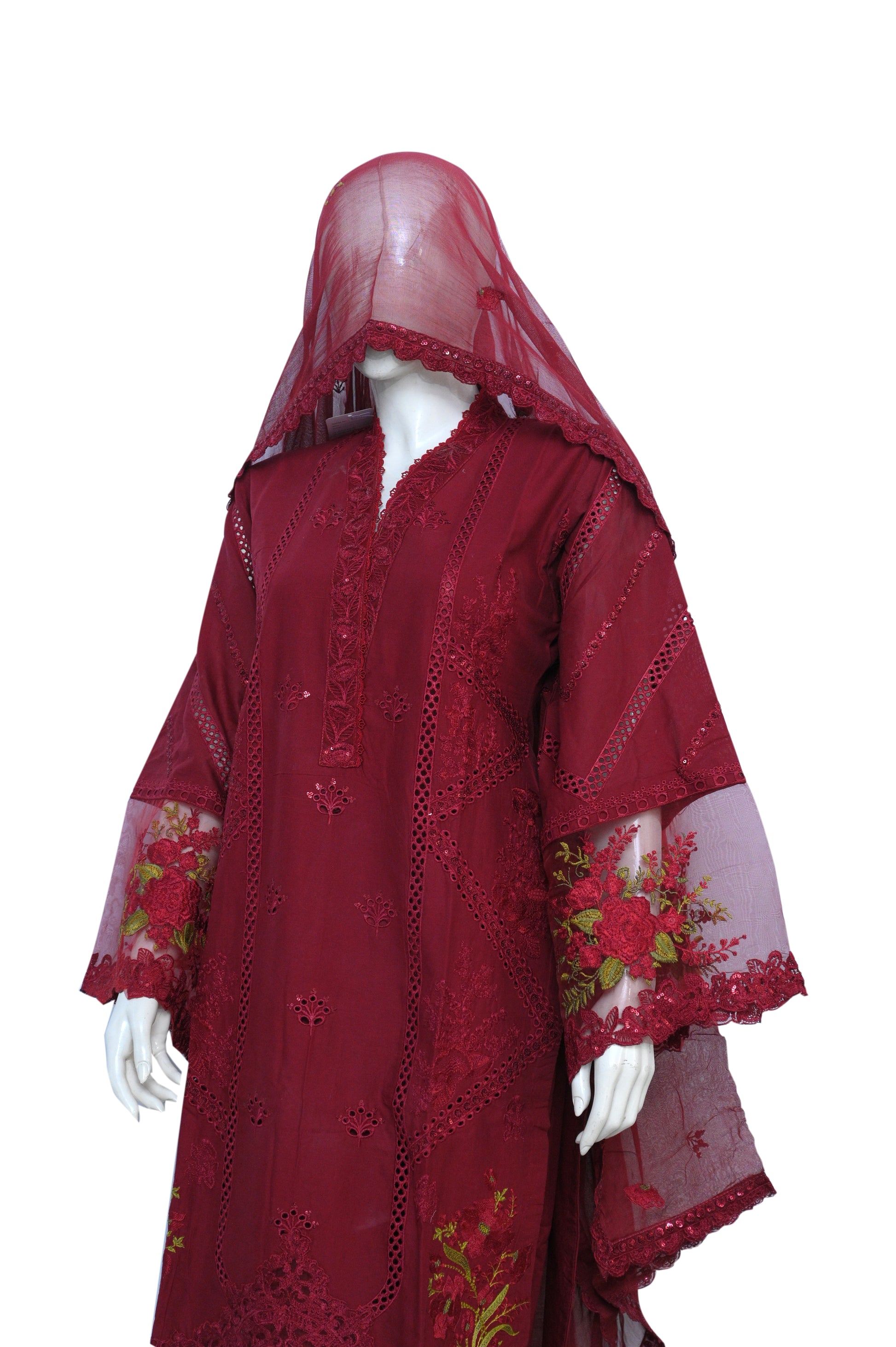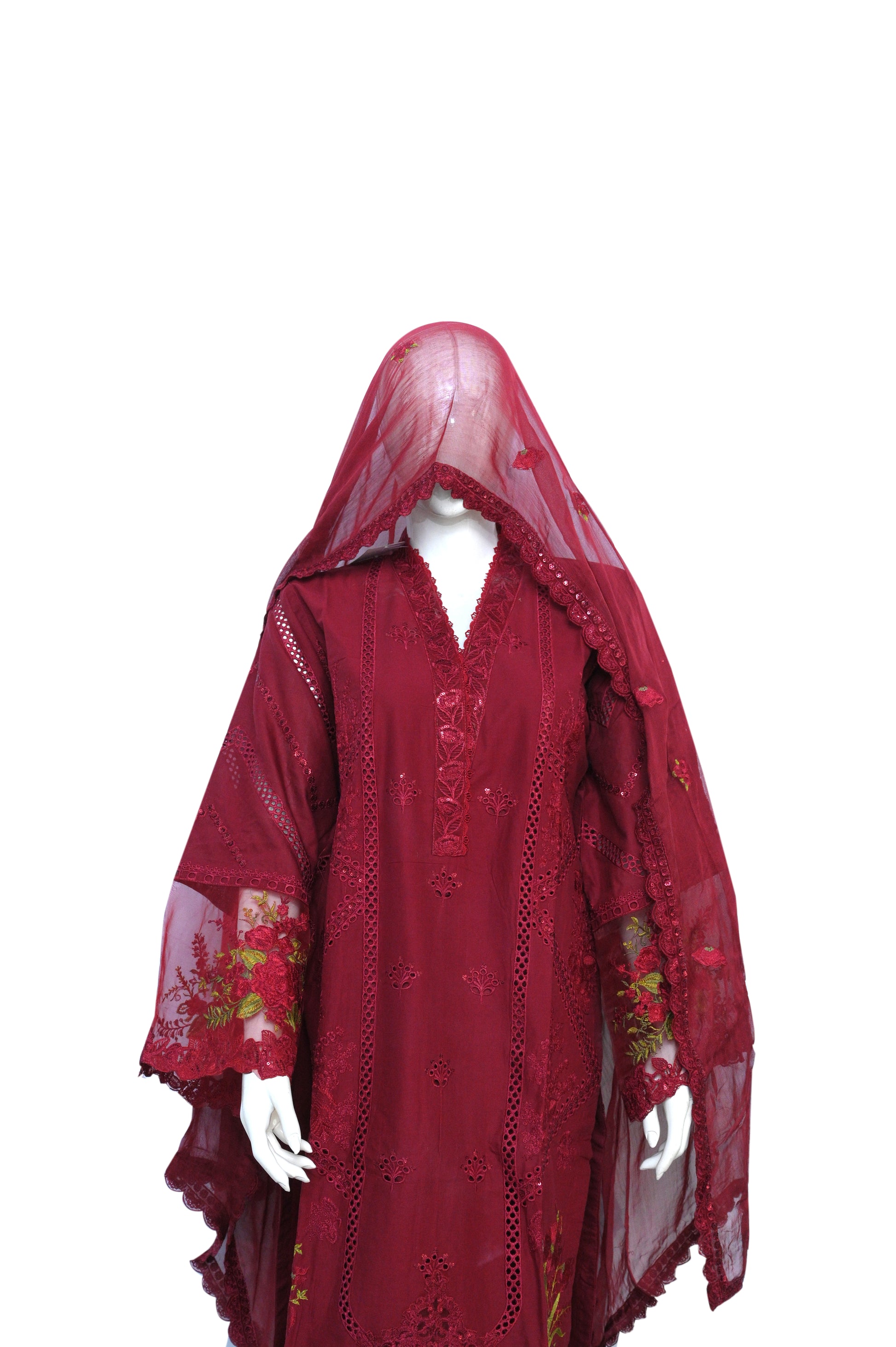 This deep red chiffon shirt is fully embroidered with self-tone threadwork on the neckline, sleeves, and hem. It’s paired with an embellished net dupatta featuring fine floral motifs and scalloped edges, and matching cotton trousers with embroidered borders.