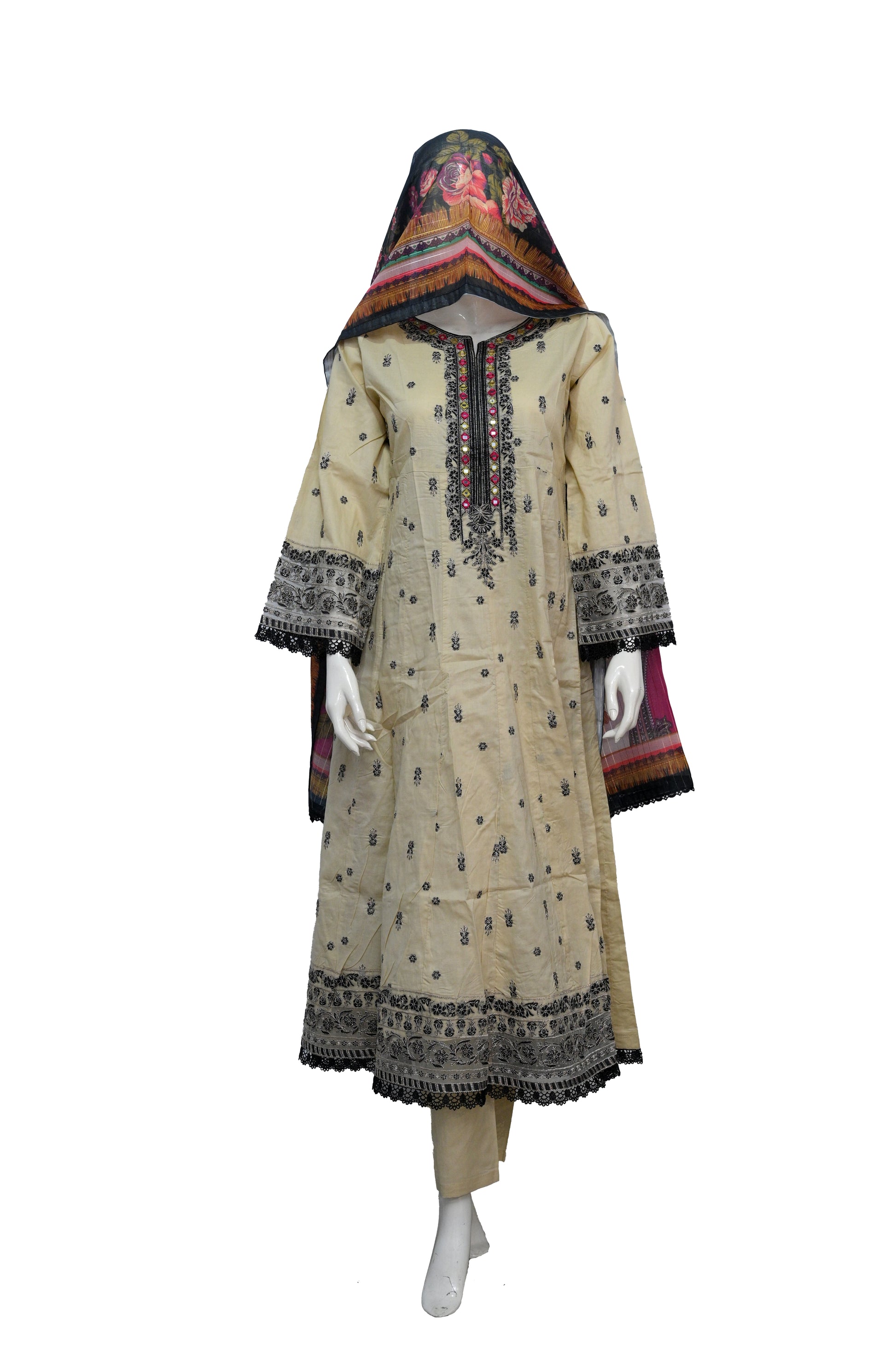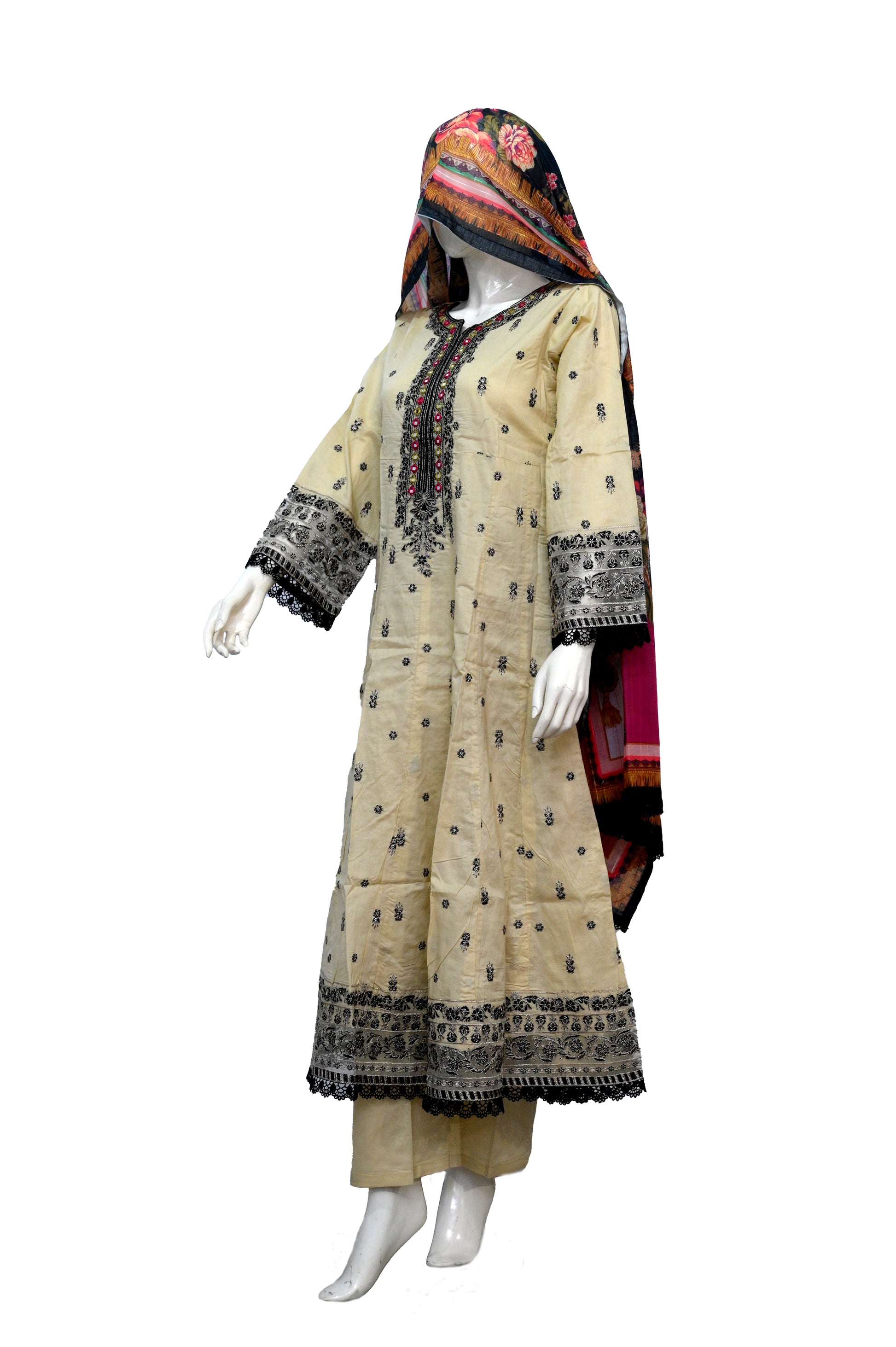This ivory silk-blend flared shirt has delicate black embroidery scattered throughout, with intricate pink and black threadwork on the neckline and cuffs, finished with lace borders. It comes with a striped lawn dupatta in black, pink, and grey, and trousers.