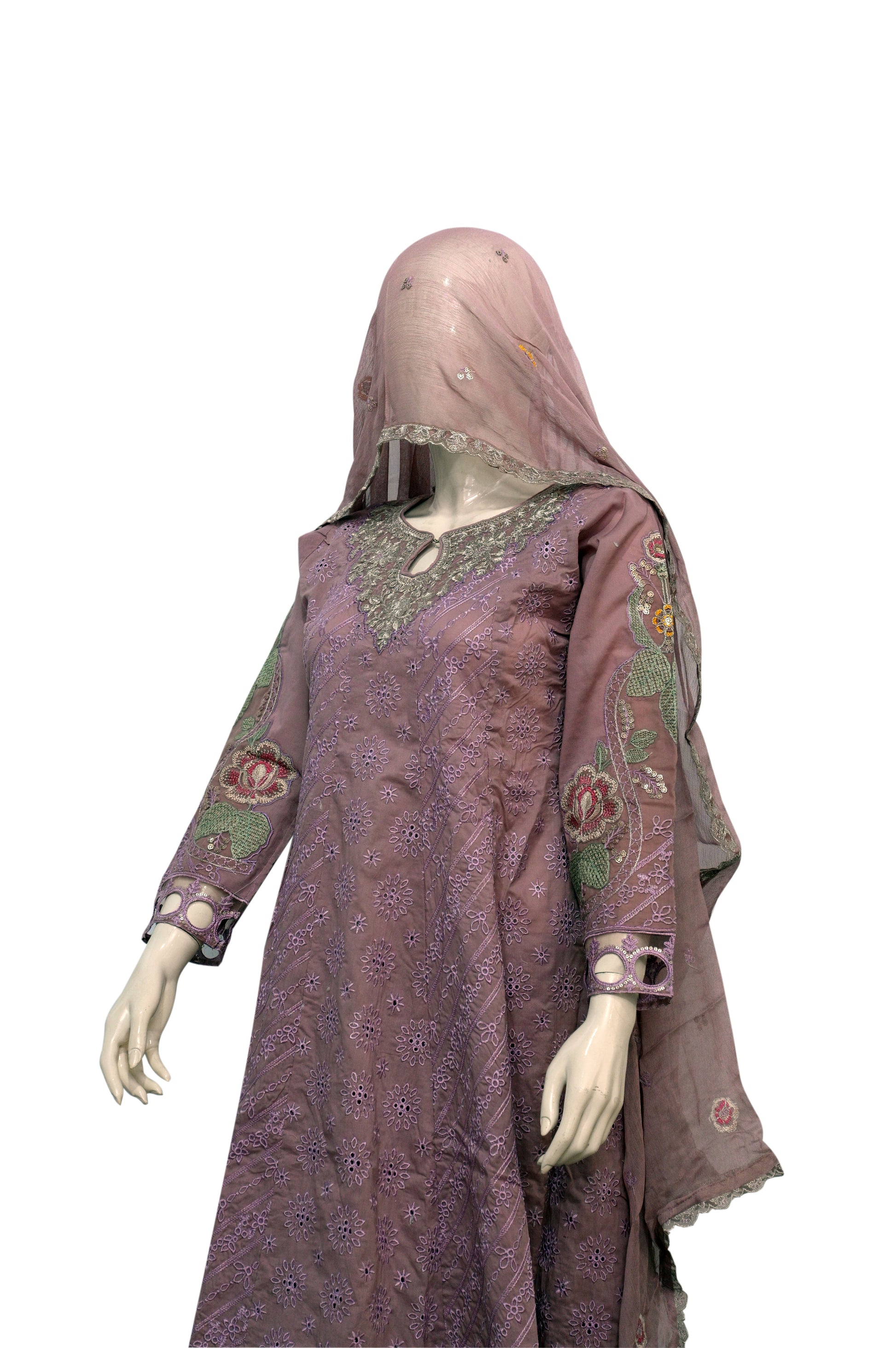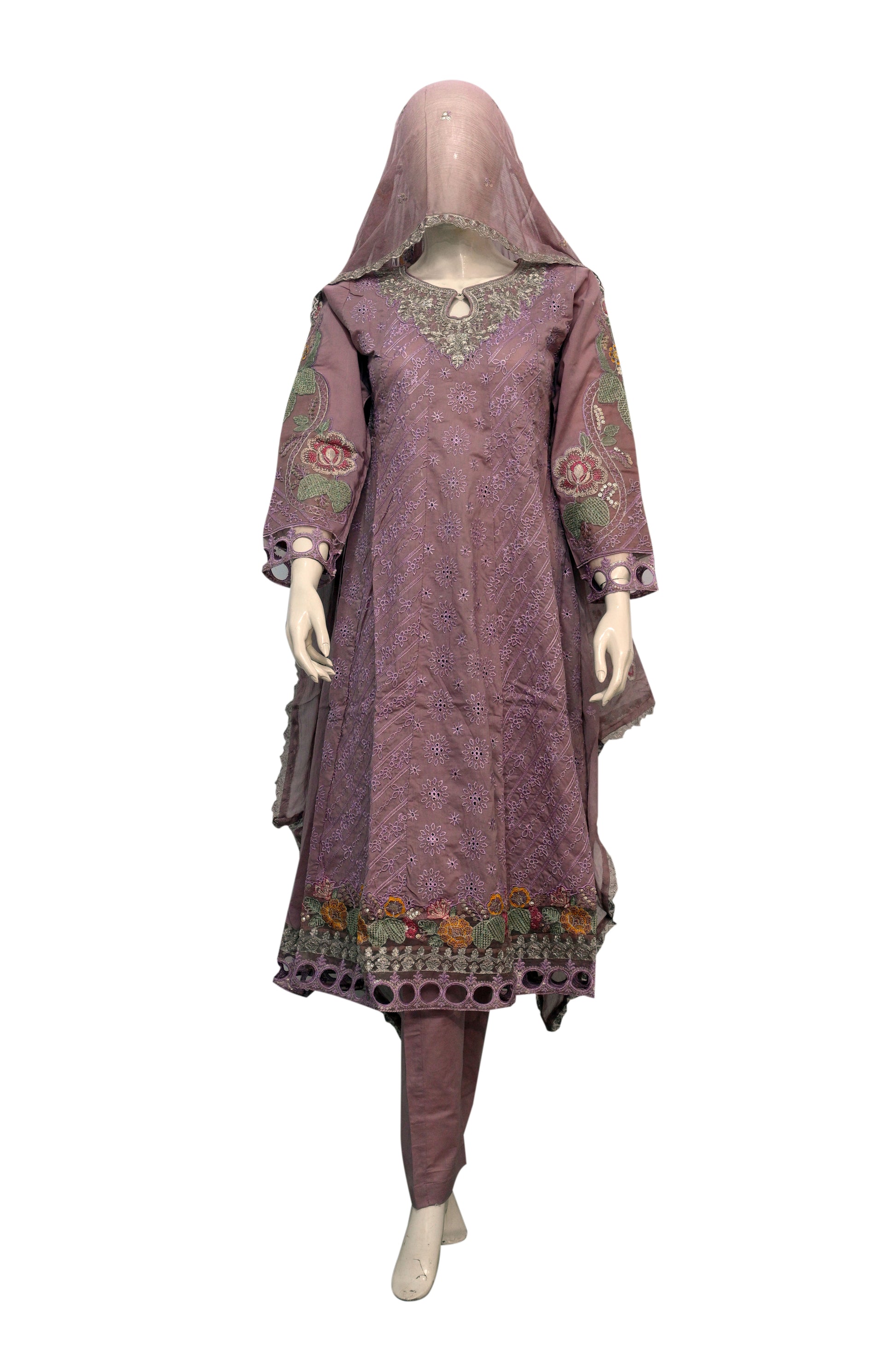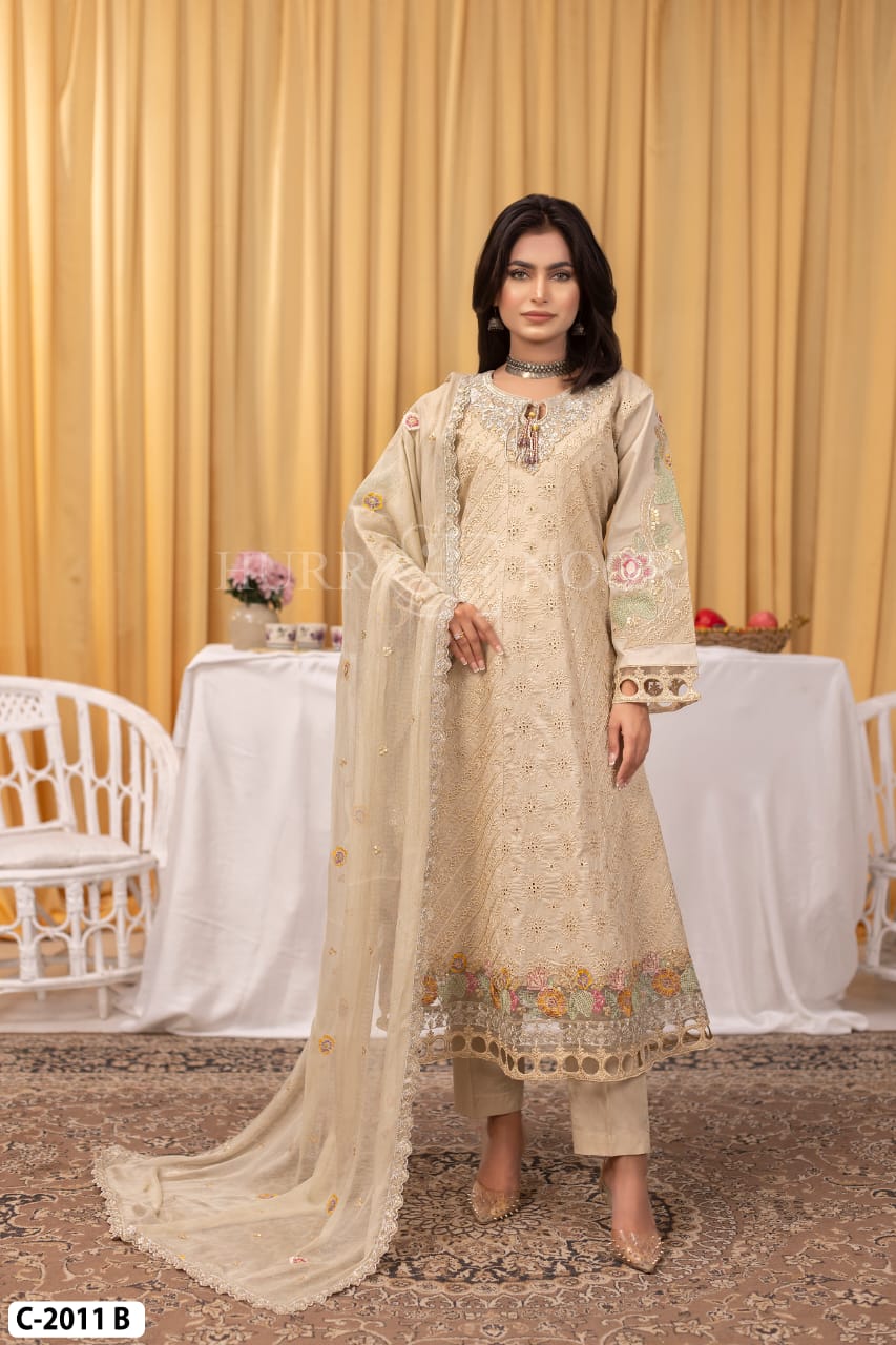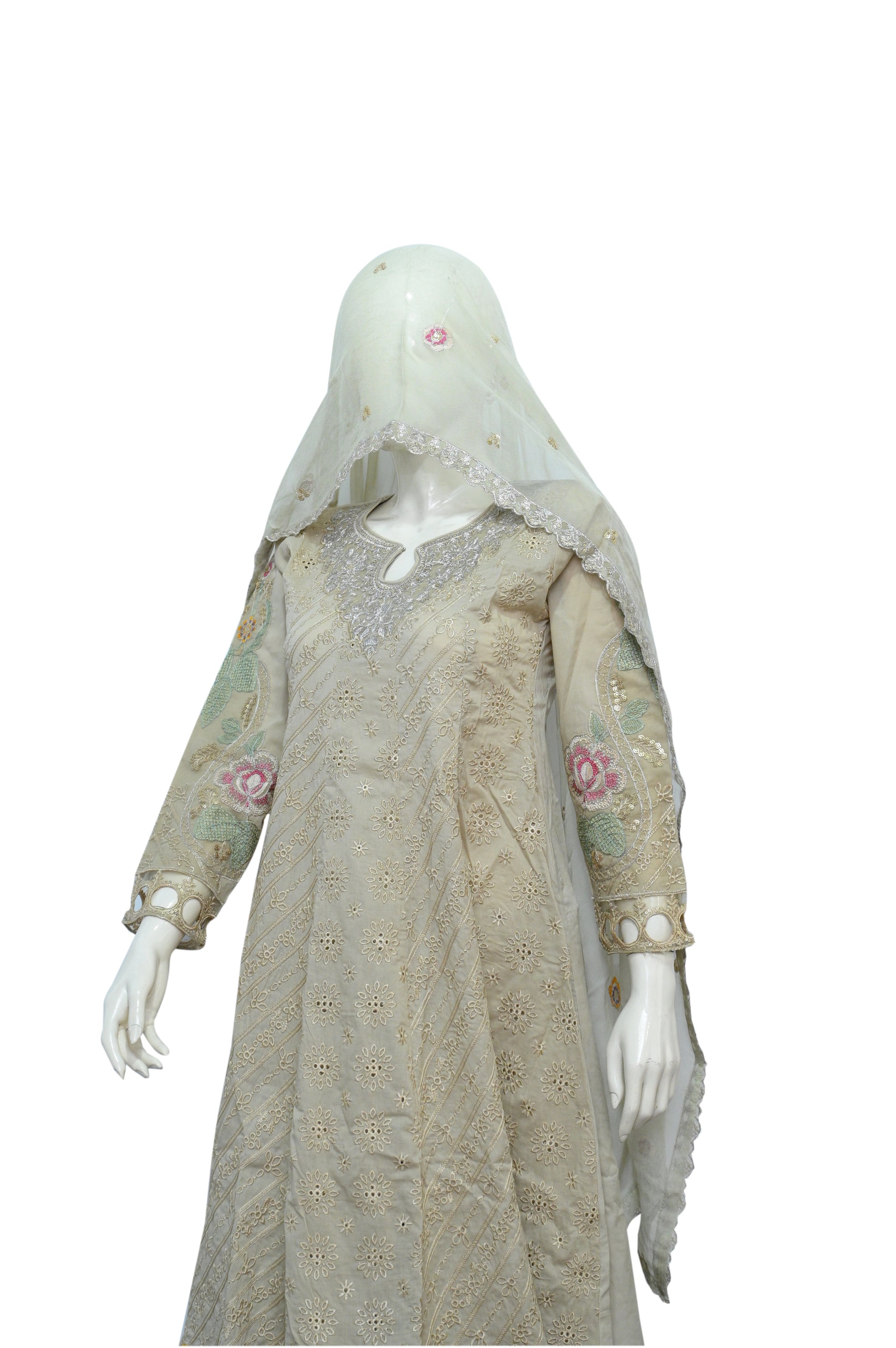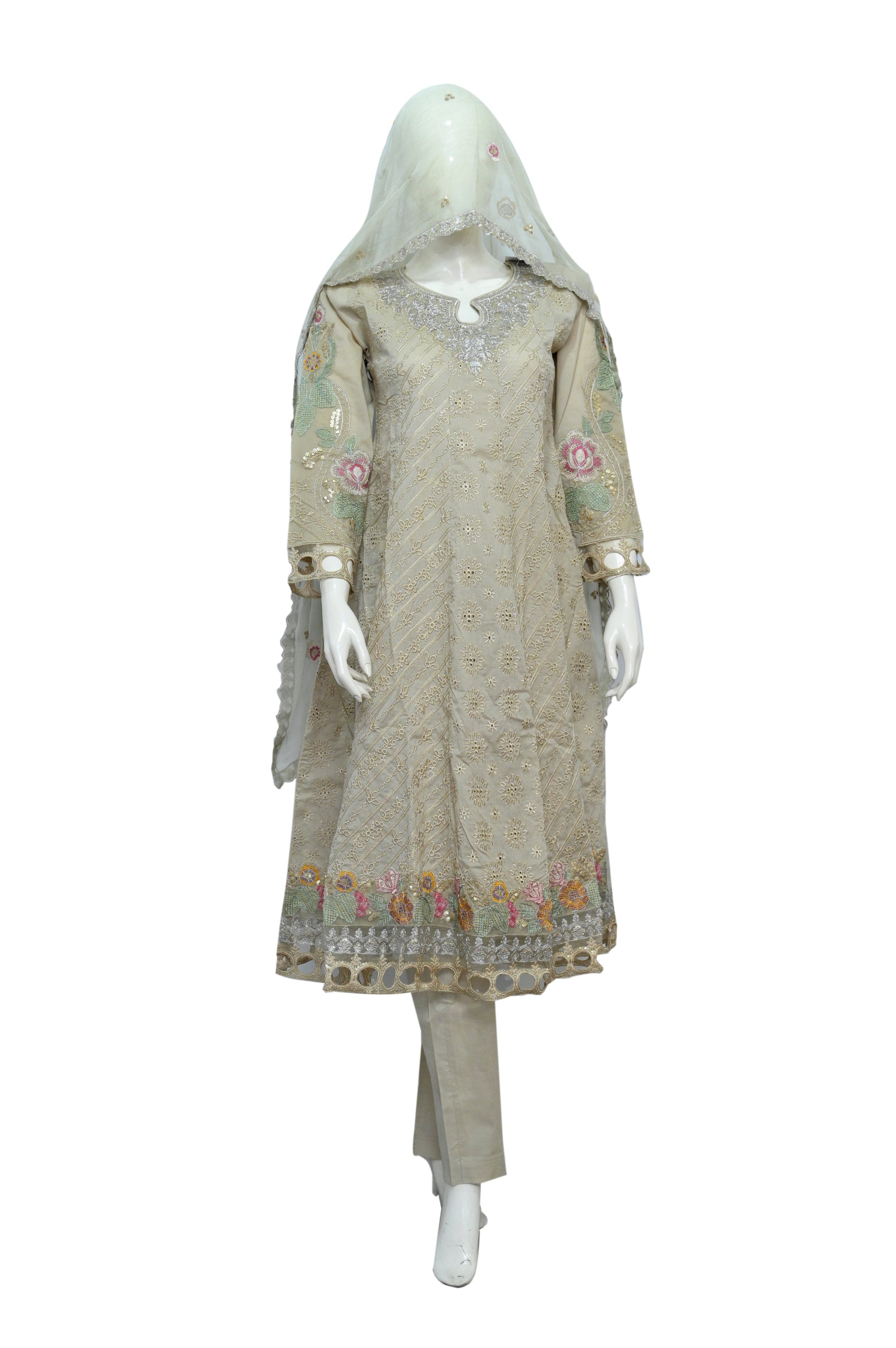 This cream-beige dress is delicately adorned with multicolor floral embroidery on the front of the top and edges of the dupatta. The trousers are simple. The sheer dupatta has a fine border that mirrors the embroidery on the dress.