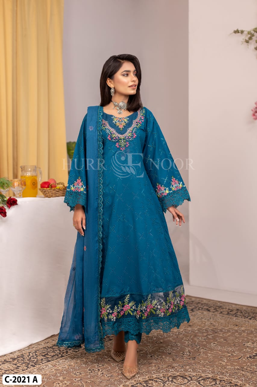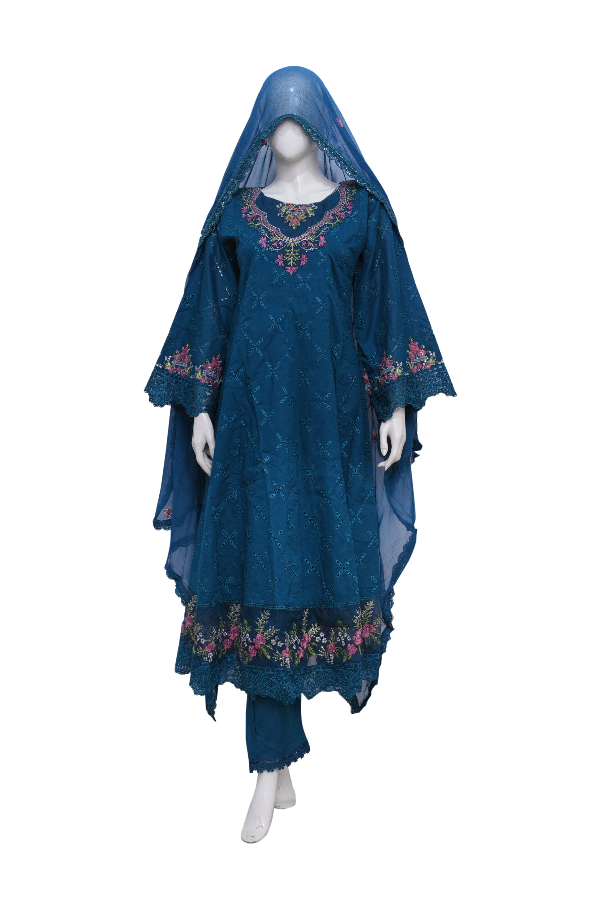 This blue dress features intricate embroidery in floral motifs across the front and sleeves. The neckline has a soft V-cut, and the dupatta is sheer with a delicate lace border. The overall look is soft, elegant, and feminine.