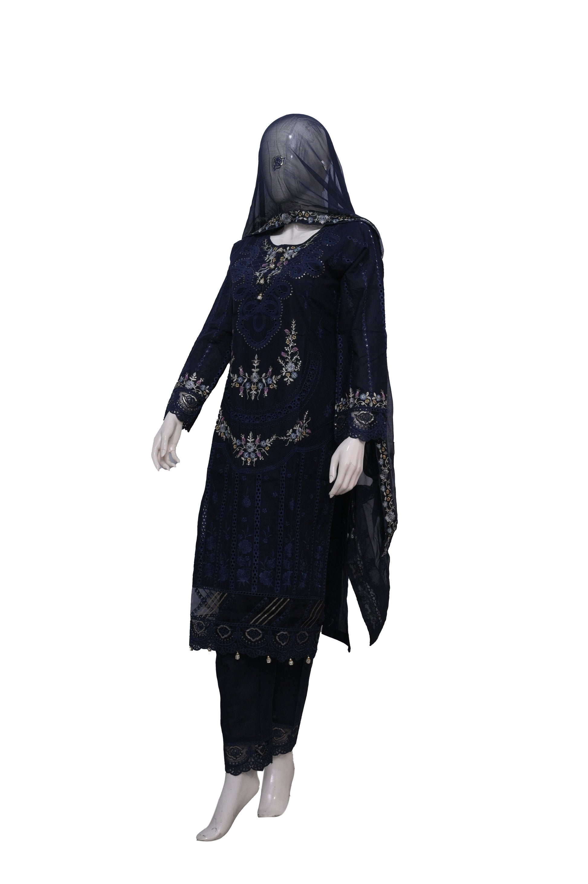 This royal blue outfit features intricate silver and white embroidery on the neckline, sleeves, and hem, creating a rich and elegant look. The matching trousers are kept simple to balance the heavily adorned top. The sheer dupatta is finished with delicate embroidery along the border, adding grace to the ensemble. Perfect for festive events or evening receptions.