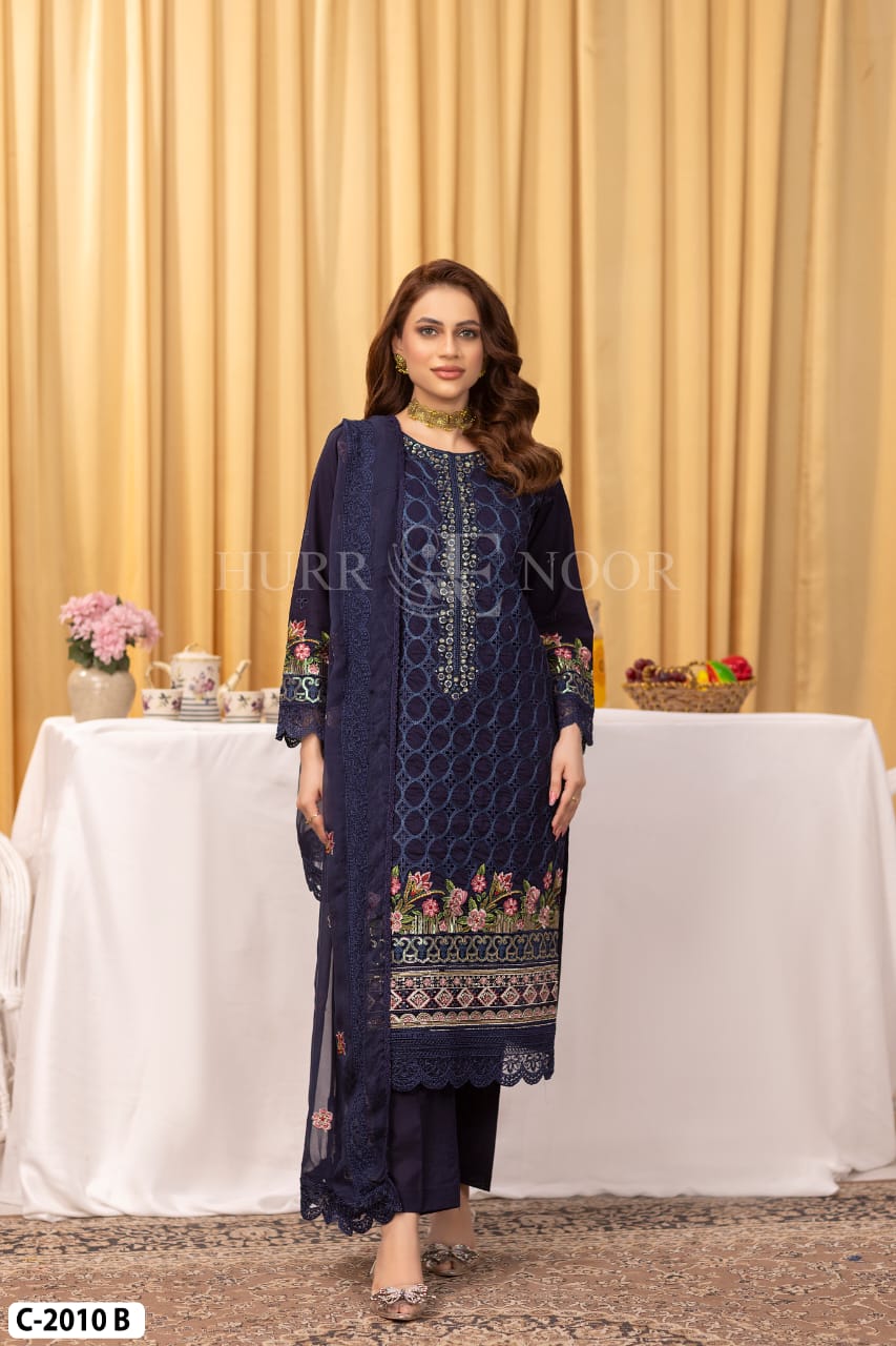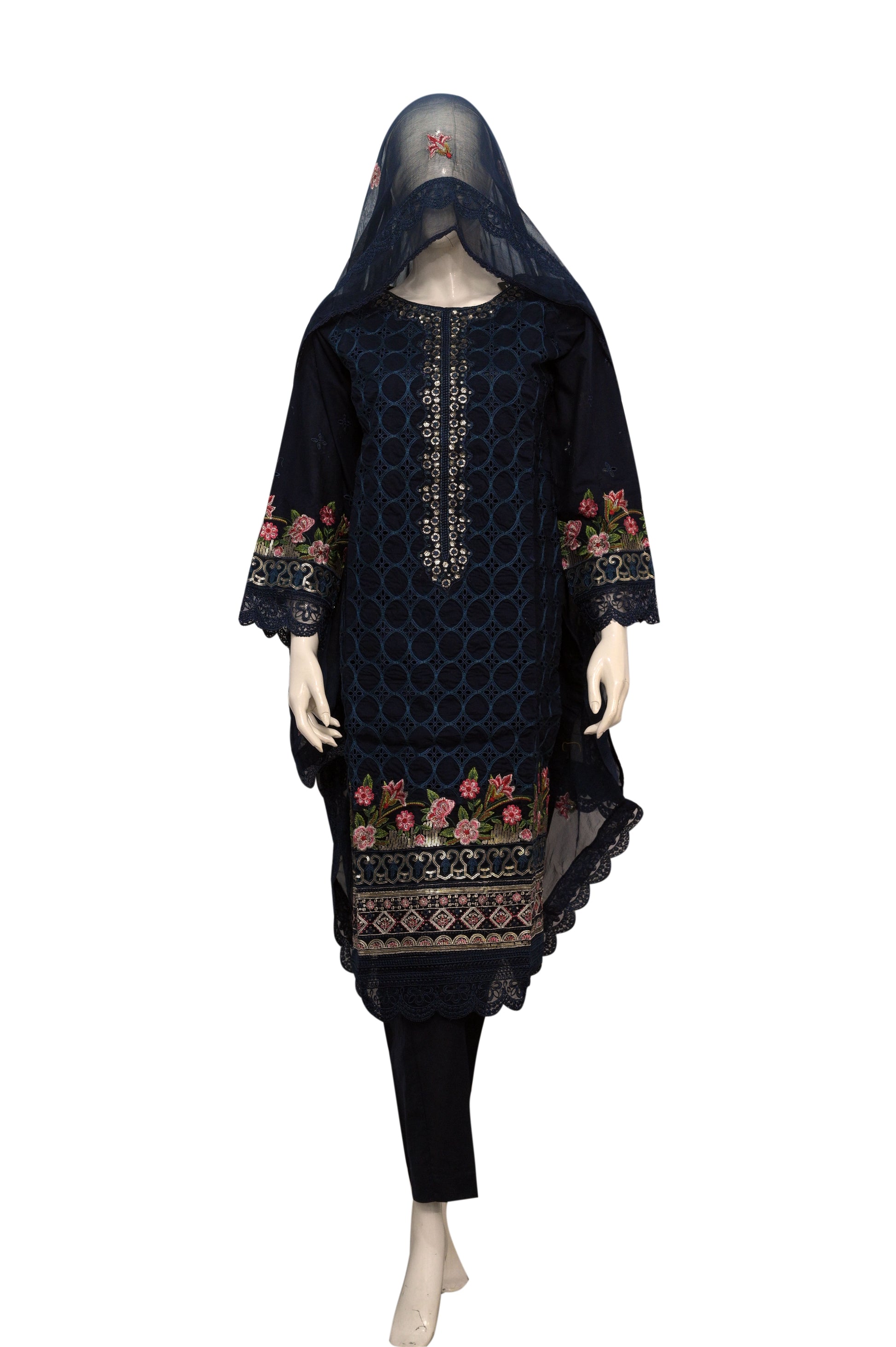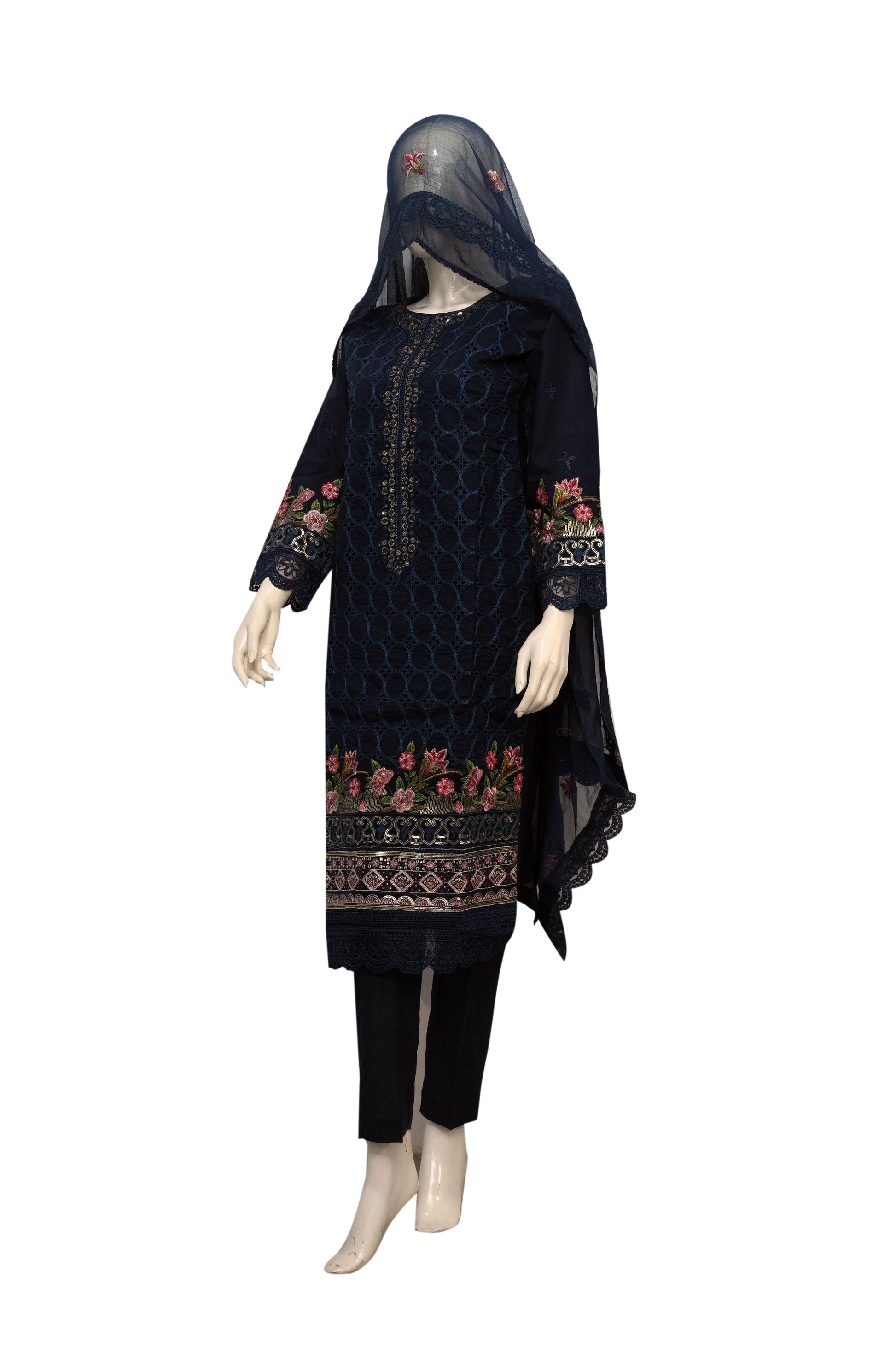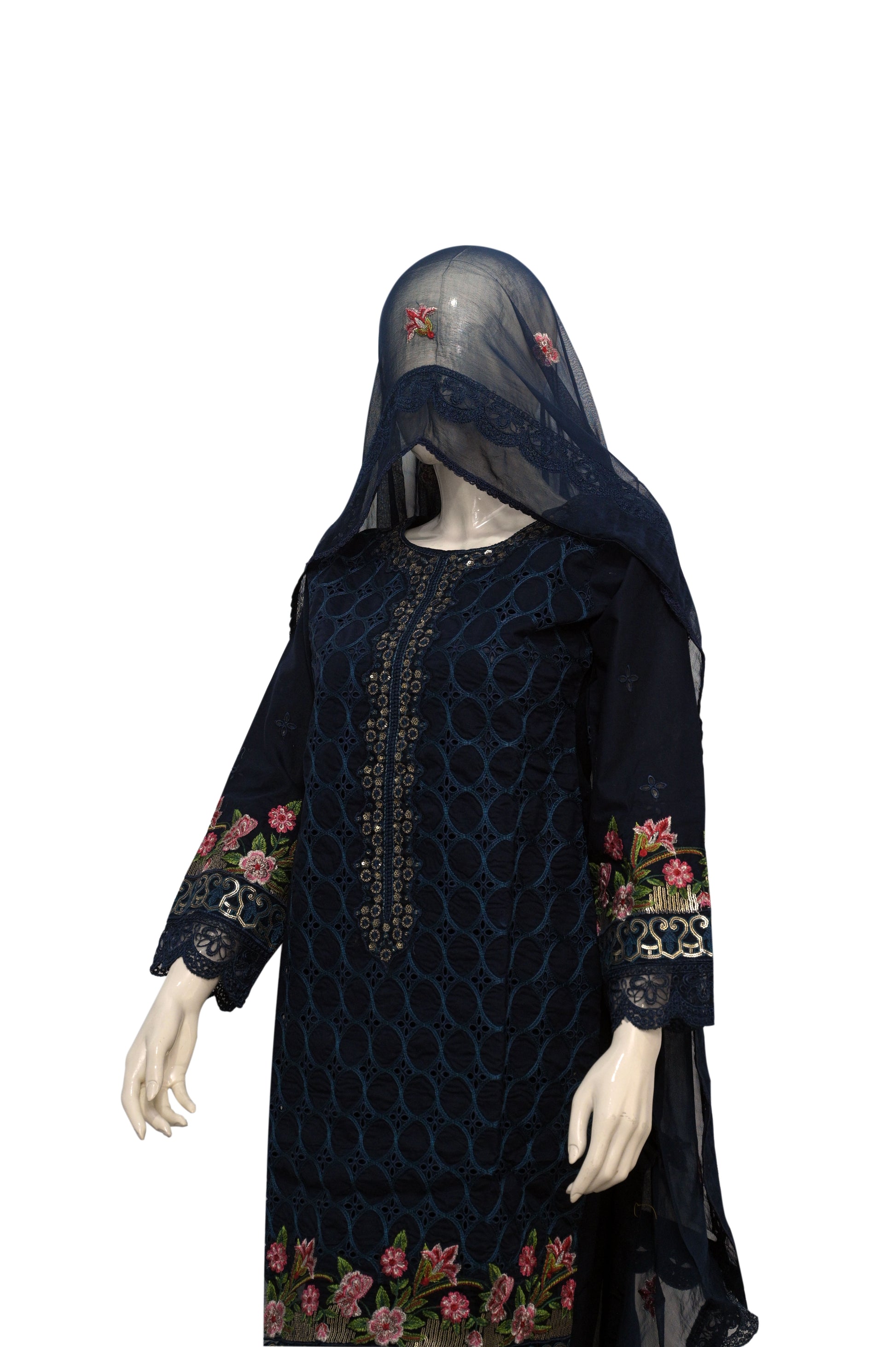 This sophisticated three-piece navy blue outfit features a long shirt with an intricate geometric lace pattern across the front, elegantly highlighted by a floral embroidered border in shades of pink and green along the hem. The neckline is adorned with fine embroidery, and the sleeves showcase matching floral embroidery, adding a touch of color and elegance. It is paired with plain navy blue straight trousers and completed with a semi-sheer navy blue dupatta, delicately detailed with scattered floral motifs and a scalloped lace border.