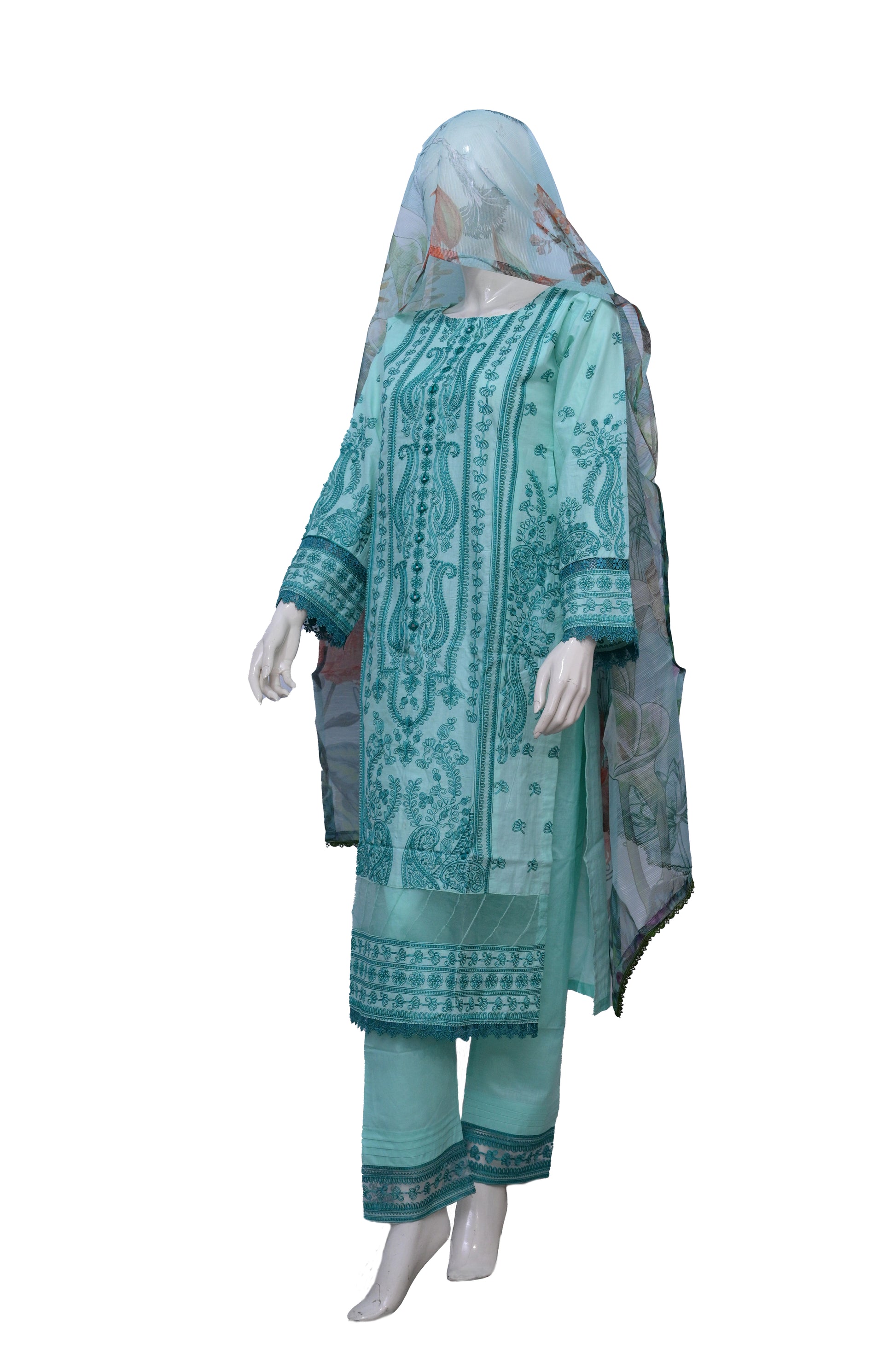 This elegant three-piece light green outfit features a straight-cut shirt adorned with intricate green embroidery in a classic baroque style, running vertically along the front and across the sleeves. The neckline is simple and rounded, maintaining a clean look, while the hem is enhanced with a wide embroidered border. It is paired with matching green straight trousers and completed with a semi-sheer printed dupatta featuring a vibrant floral and foliage pattern, adding a fresh and colorful touch to the ensemble.