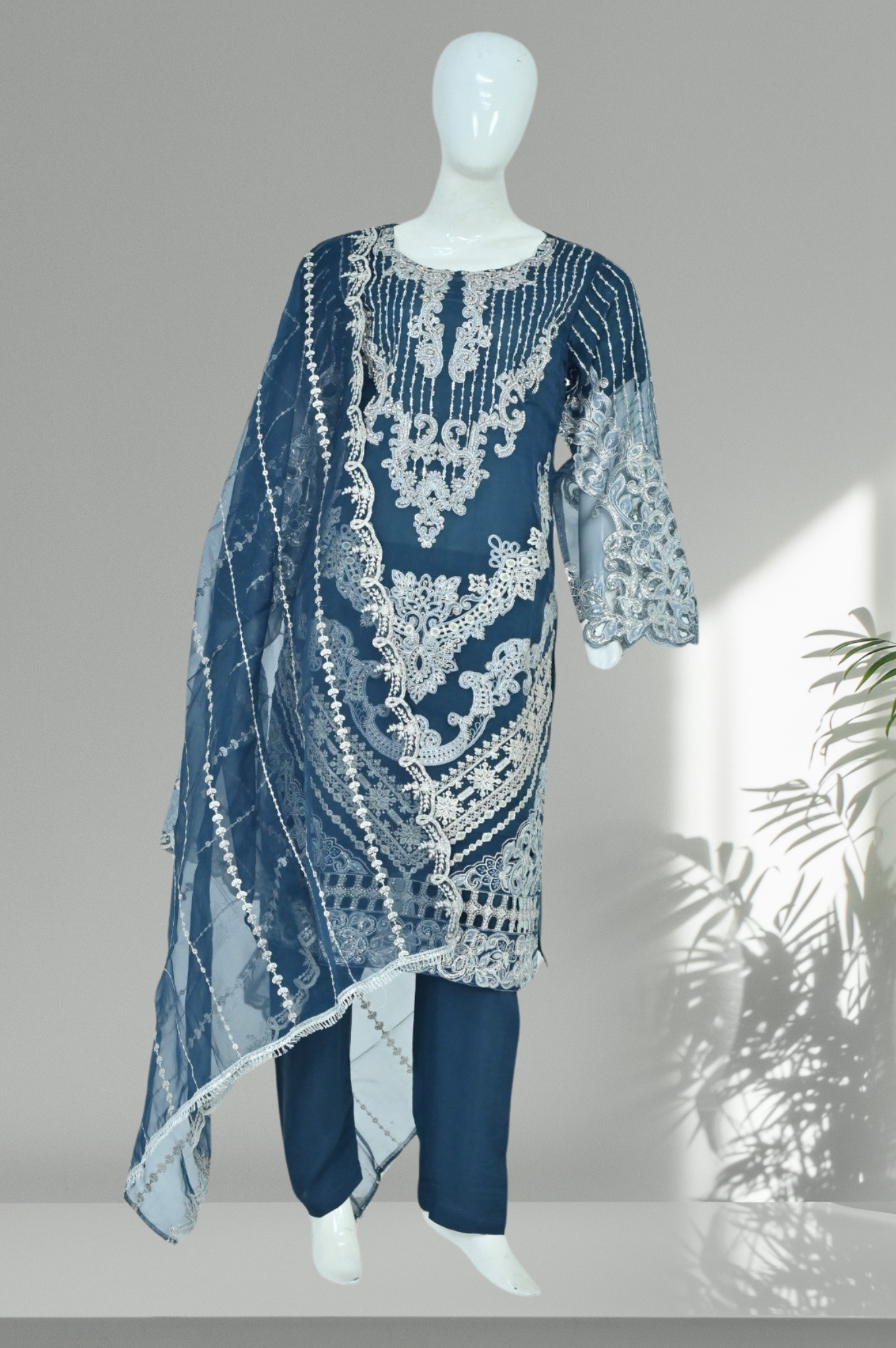 Questo elegante completo di 3 pezzi, Swera B BL - 141, è realizzato in organza di alta qualità, caratterizzato da pregiati ricami e lavori a mano. Il pantalone in seta cinese aggiunge un tocco di lusso, mentre il dupatta in organza impreziosisce ulteriormente l'outfit. Il perfetto mix tra design e artigianato.