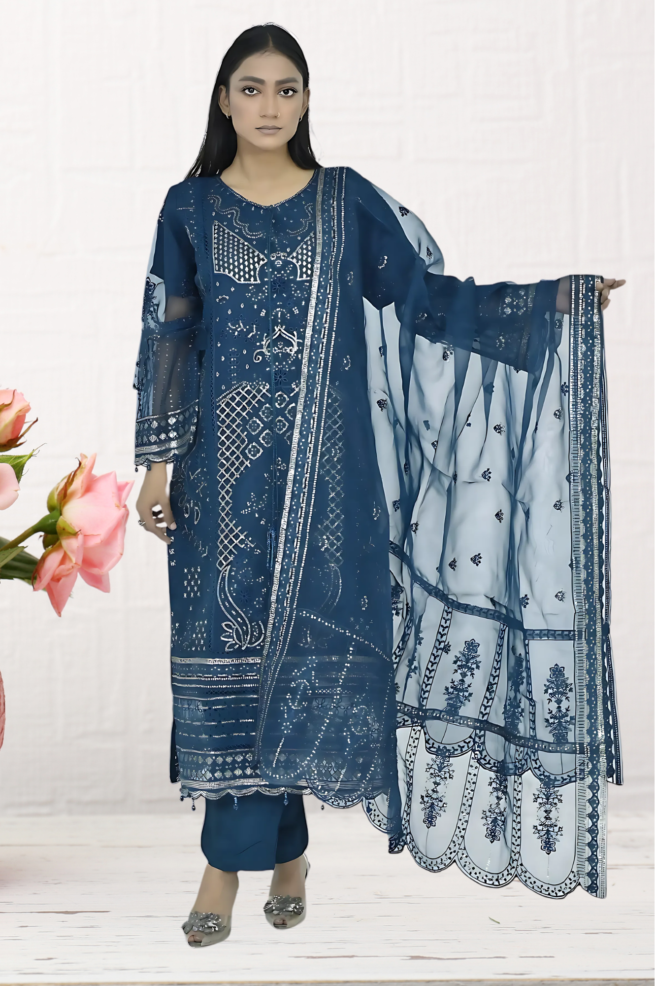 Esprimi il tuo stile con il set Swera B BL - 141 (F-8)! Questo set comprende una lunga camicia di organza con ricami e lavorazione sitari, un dupatta di organza con dettagli ricamati e un pantalone di tessuto in seta di porcellana. Aggiungi un tocco di eleganza al tuo guardaroba con questo set unico.