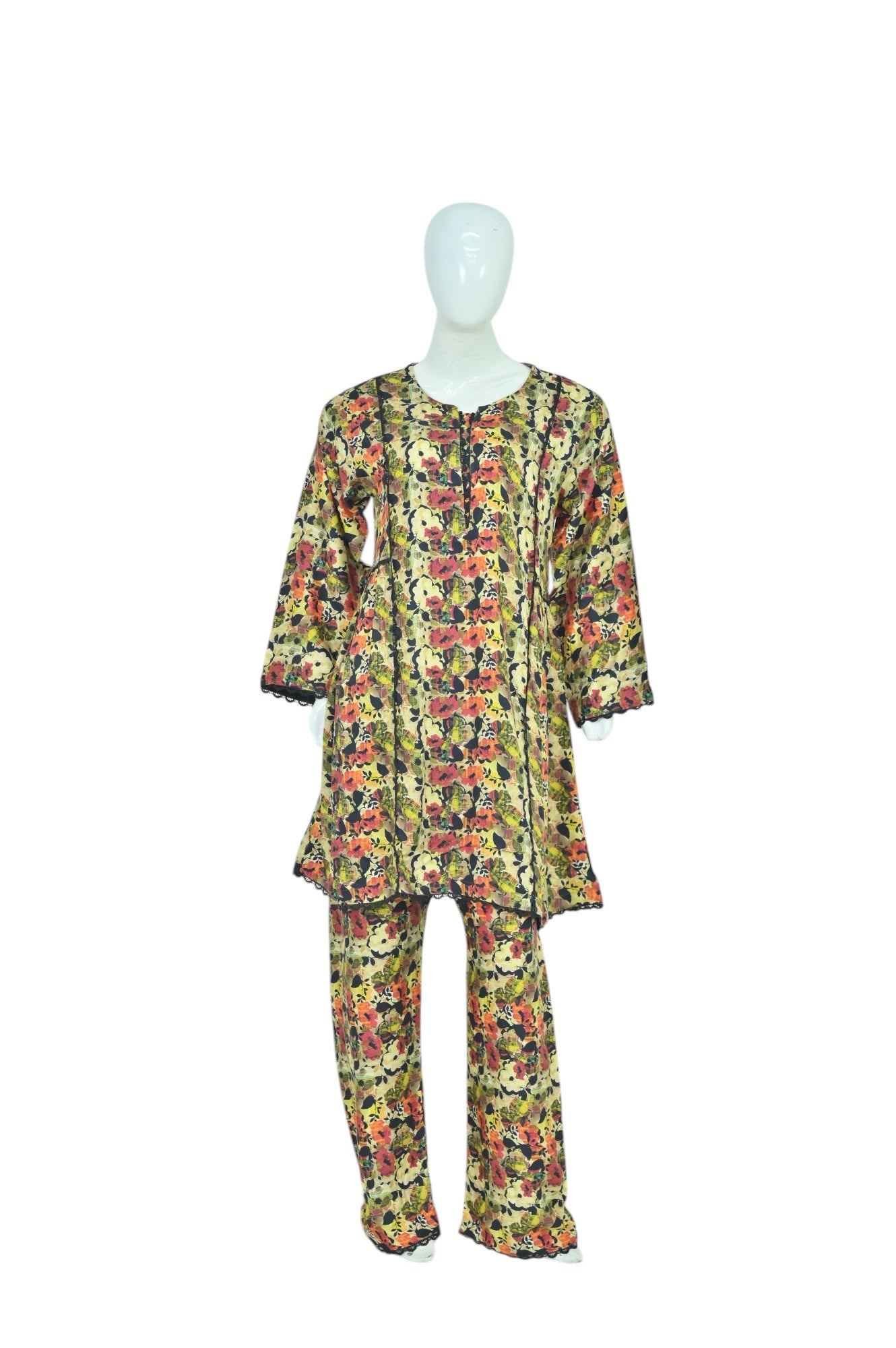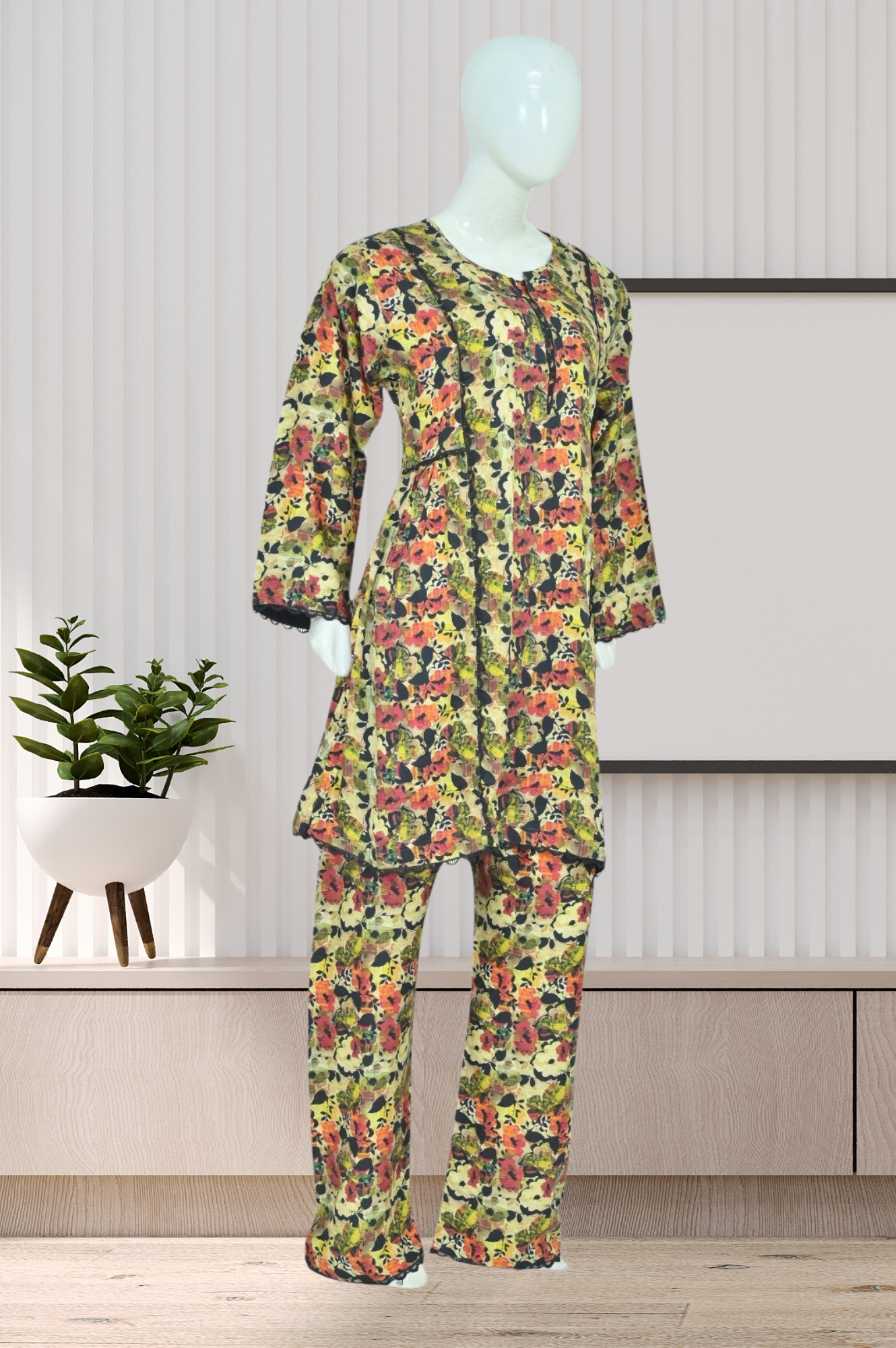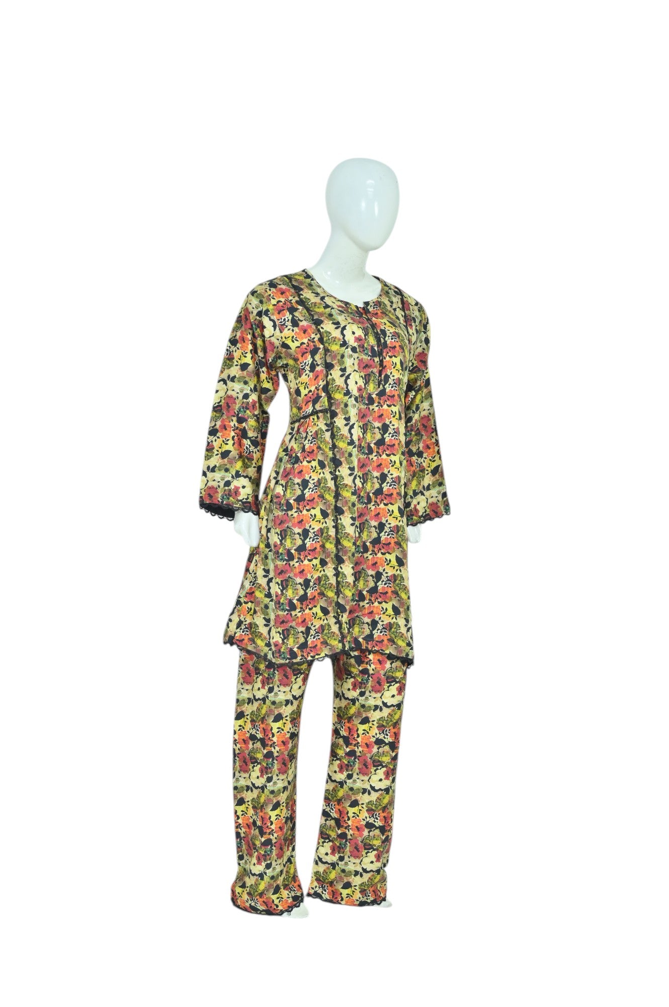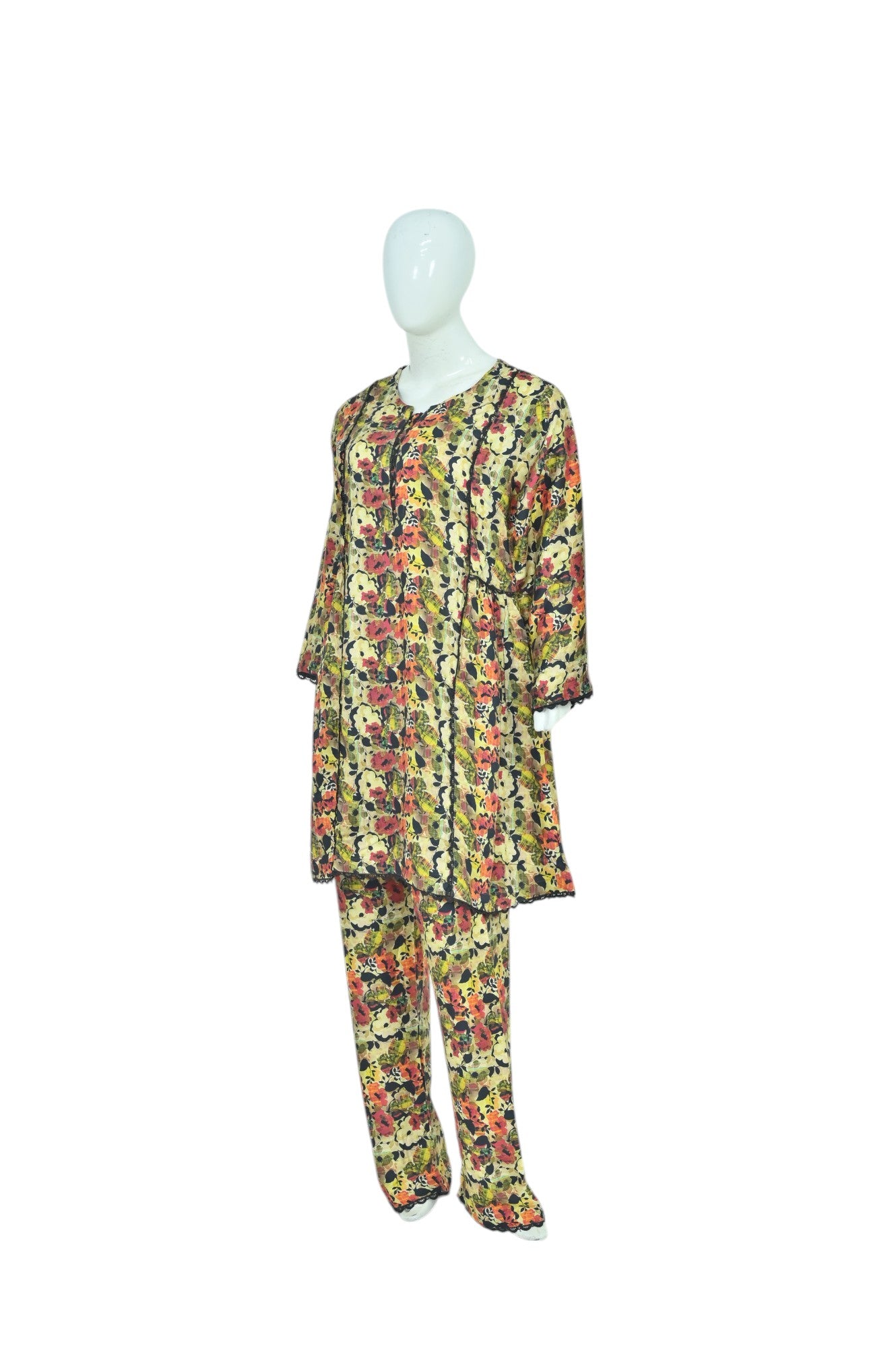 Swera B HK - 11113 (A) è composto da 2 pezzi: una vestaglia e un pantalone. La vestaglia è realizzata con tessuto importato, con un elegante collo, polsini e bordo arricchiti da merletti e un irresistibile motivo floreale. Il pantalone è anch'esso realizzato con tessuto importato e presenta un dettaglio di bottoni con merletti. Taglia unica. Un look sofisticato che ti farà sentire unica.
